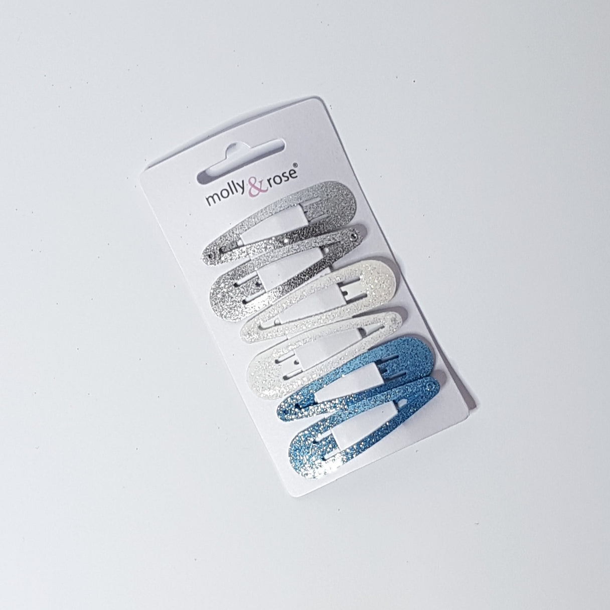Molly & Rose hårklemmer i glimmer - 2x sølv, 2x hvide og 2x blå.