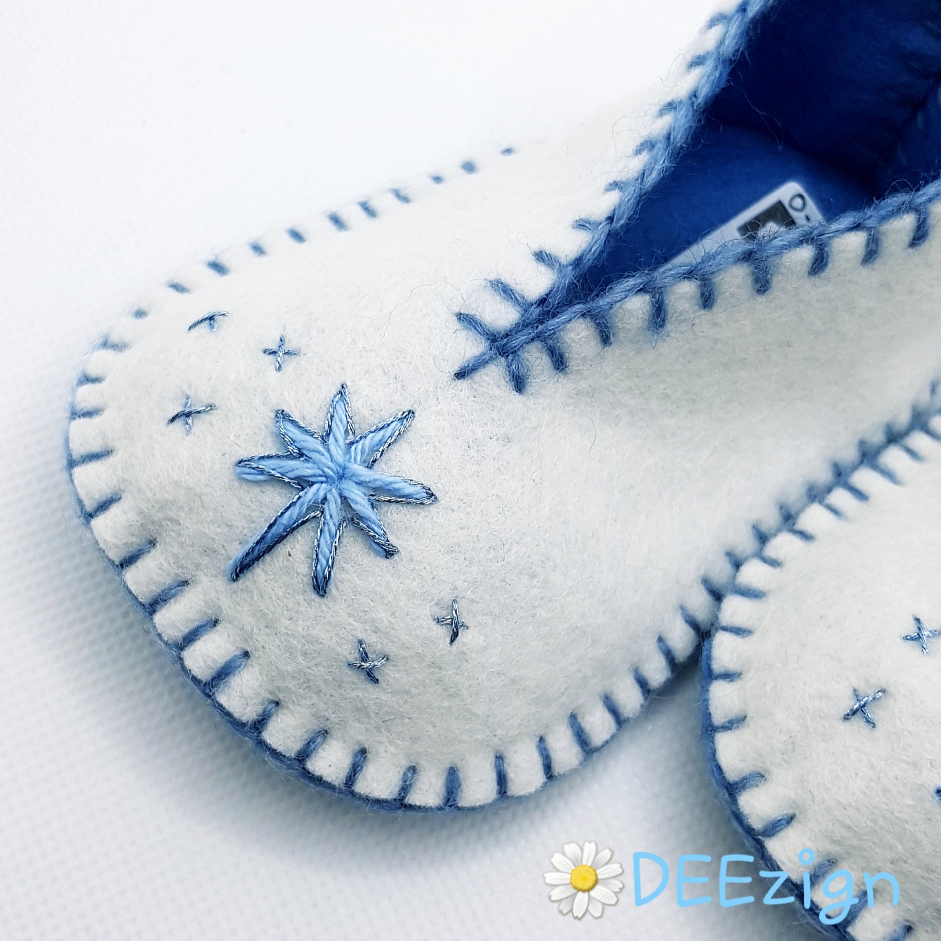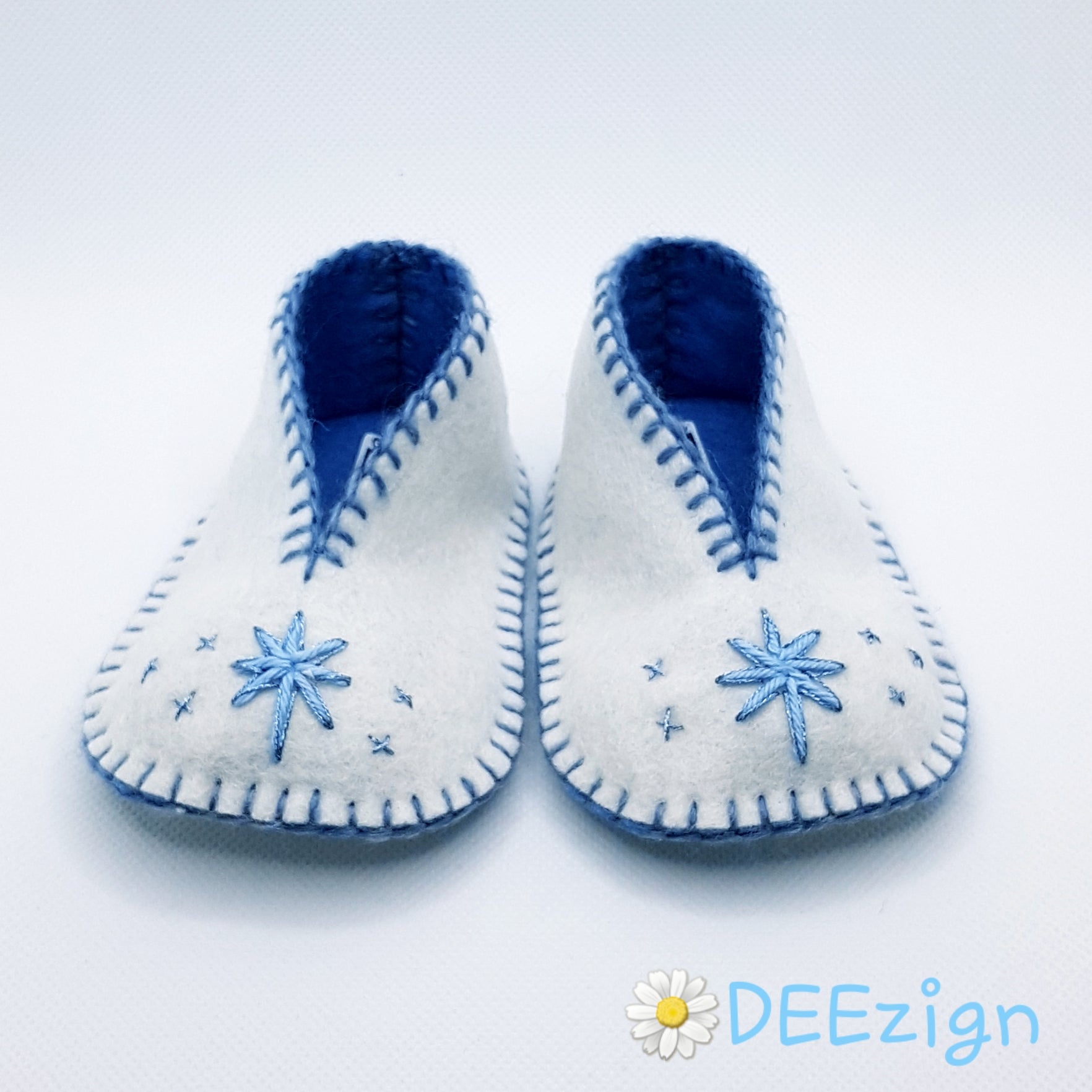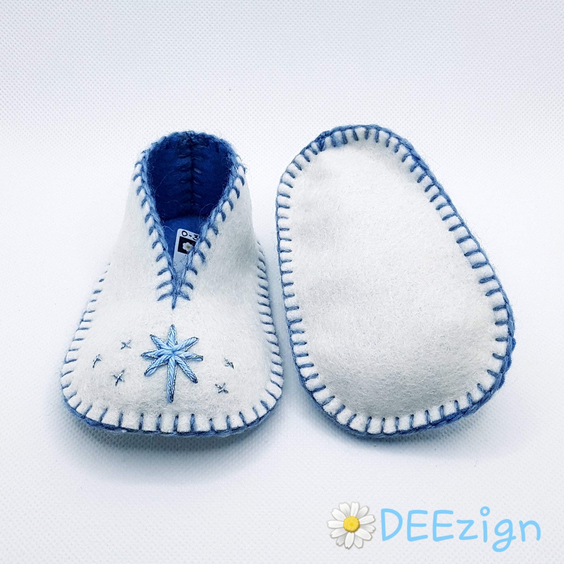 Perfekt tilføjelse til din babys dåbsdragt - elegante håndsyede uldne hjemmesko i en farveblanding af ren hvid & baby blå nuancer.