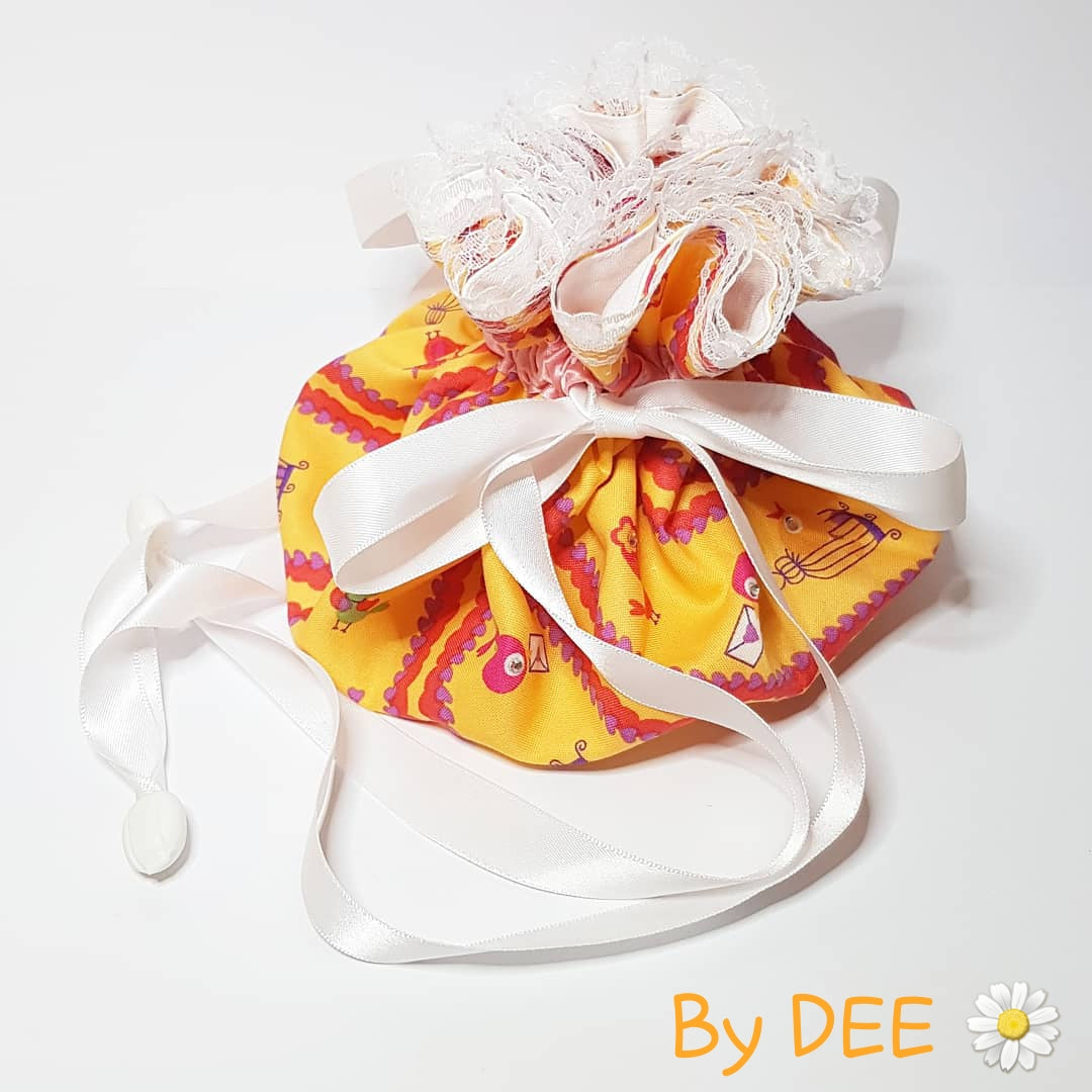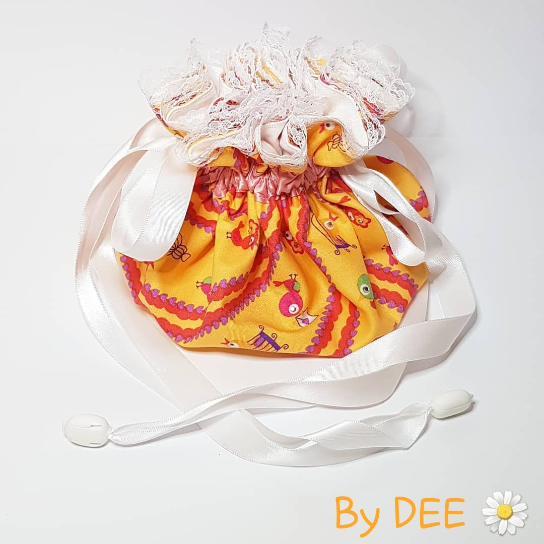 Trendy og nuttet homemade 'By DEE' BAG MEE med fugle motiver i gule, orange, lilla, grønne, lyserøde og hvide nuancer. Denne drawstring taske er pyntet med iron-on krystaller og er stor nok til at bruge som makeup taske, smykke pung eller legetøjspose.