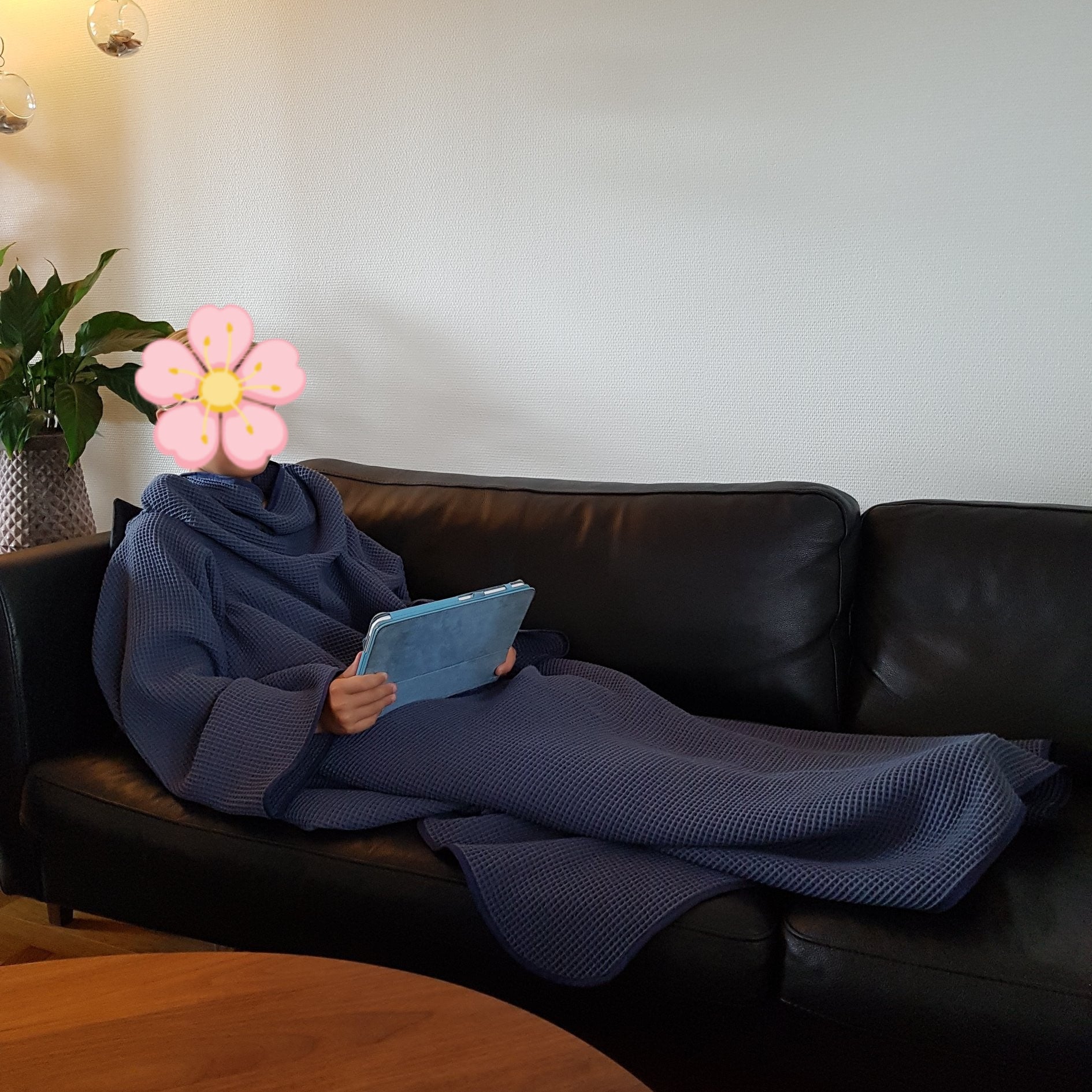 By DEE håndlavet hyggetæppe med ærmer og en lomme.