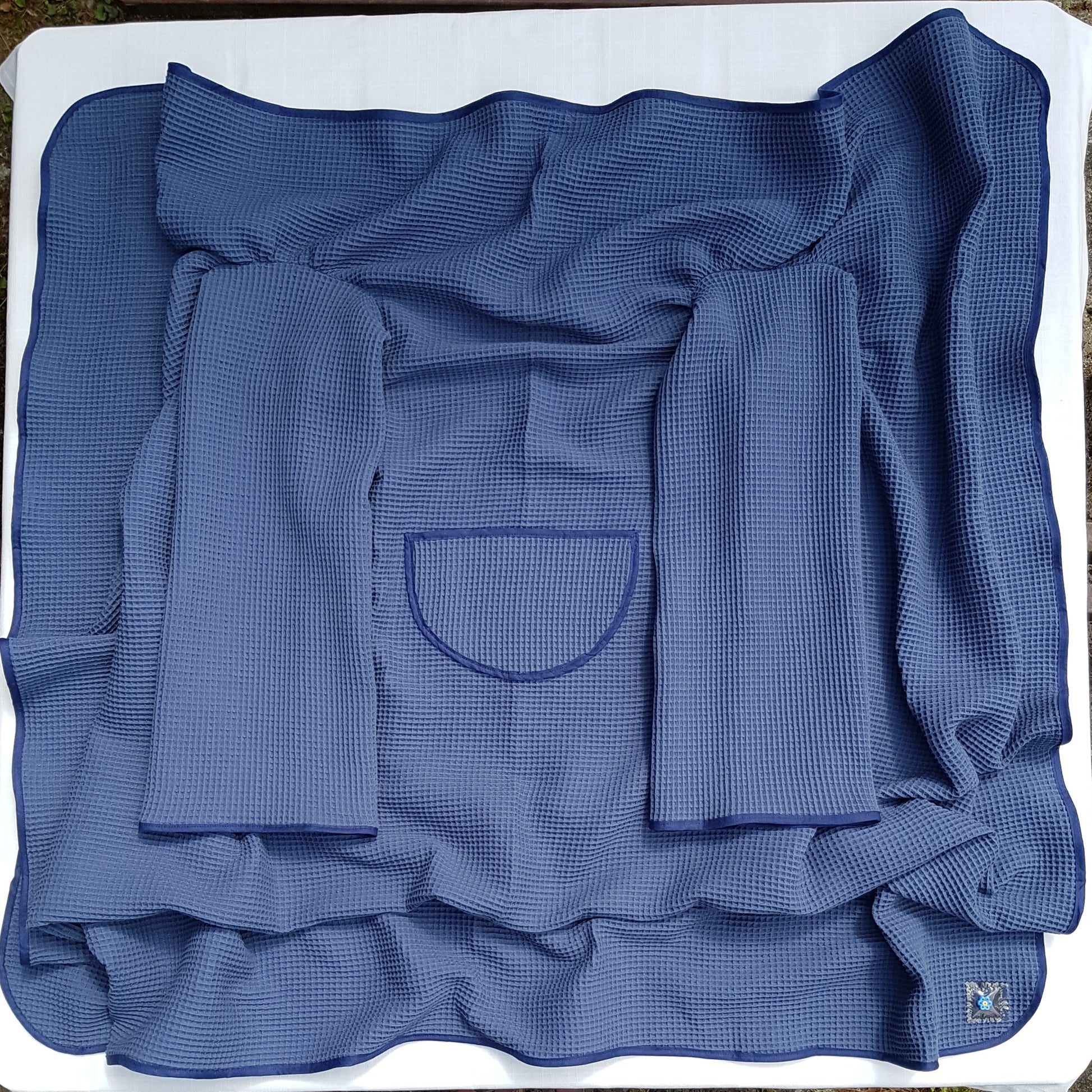 Hyggetæppet er syet med fransk søm og har en skråbåndsafslutning.