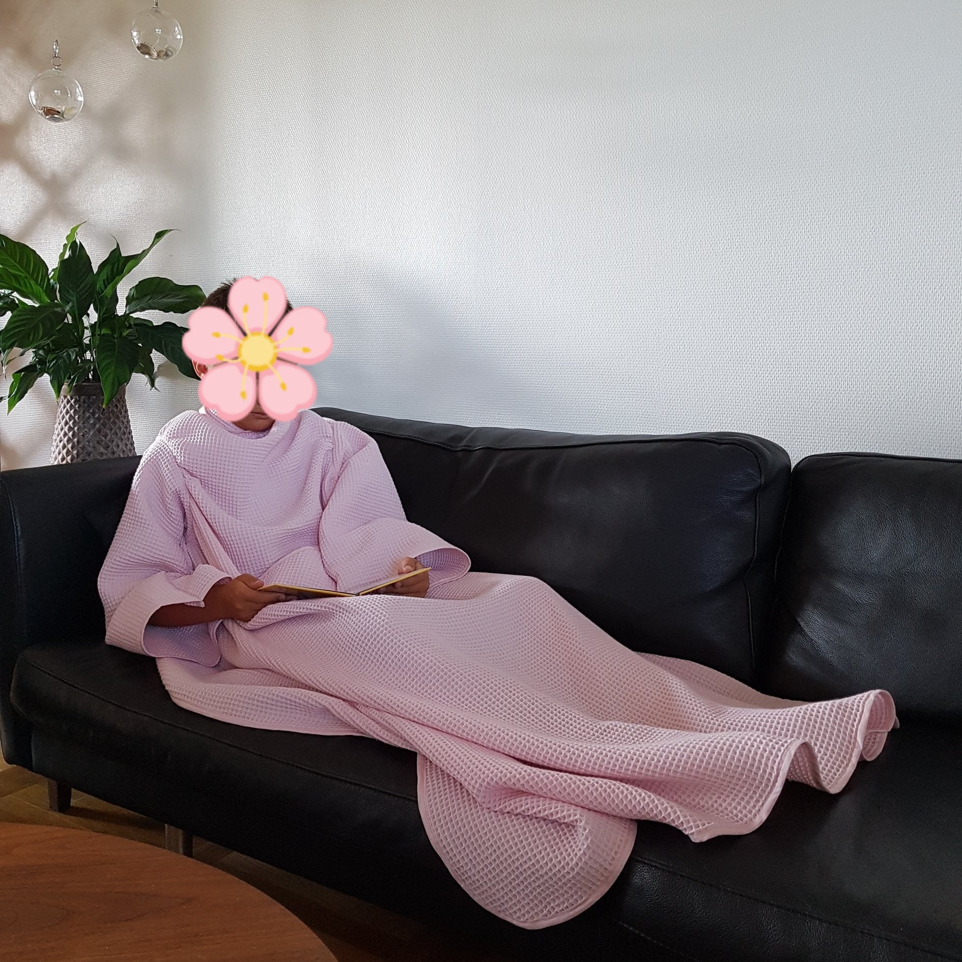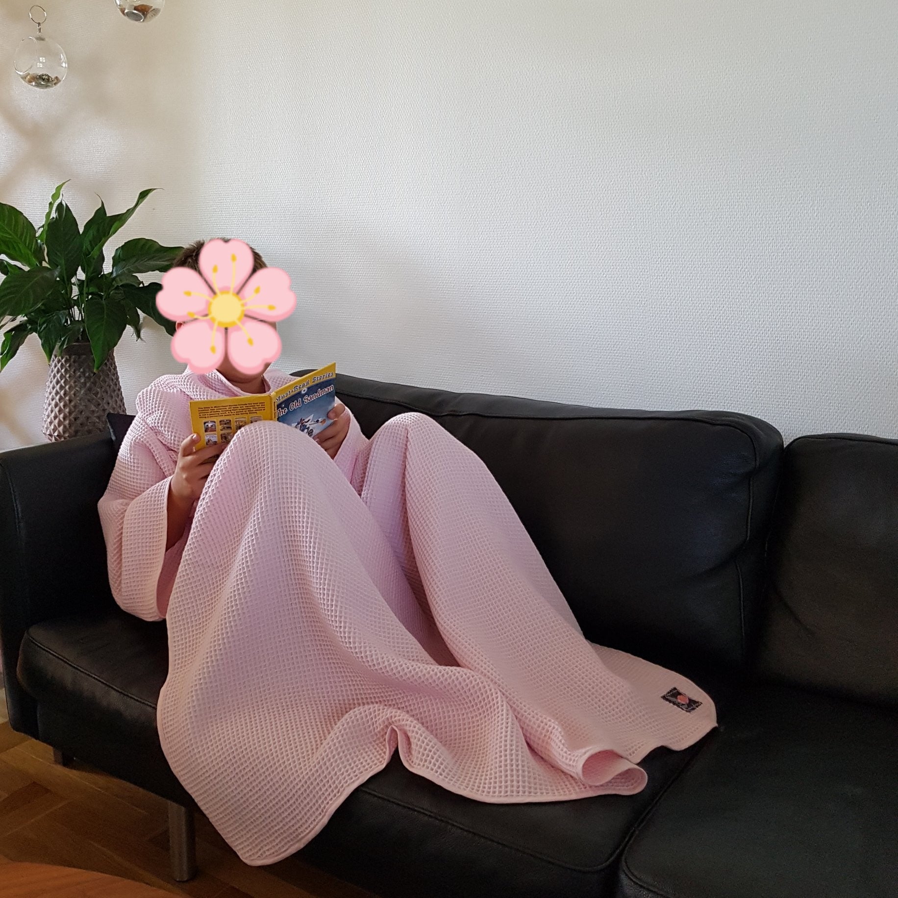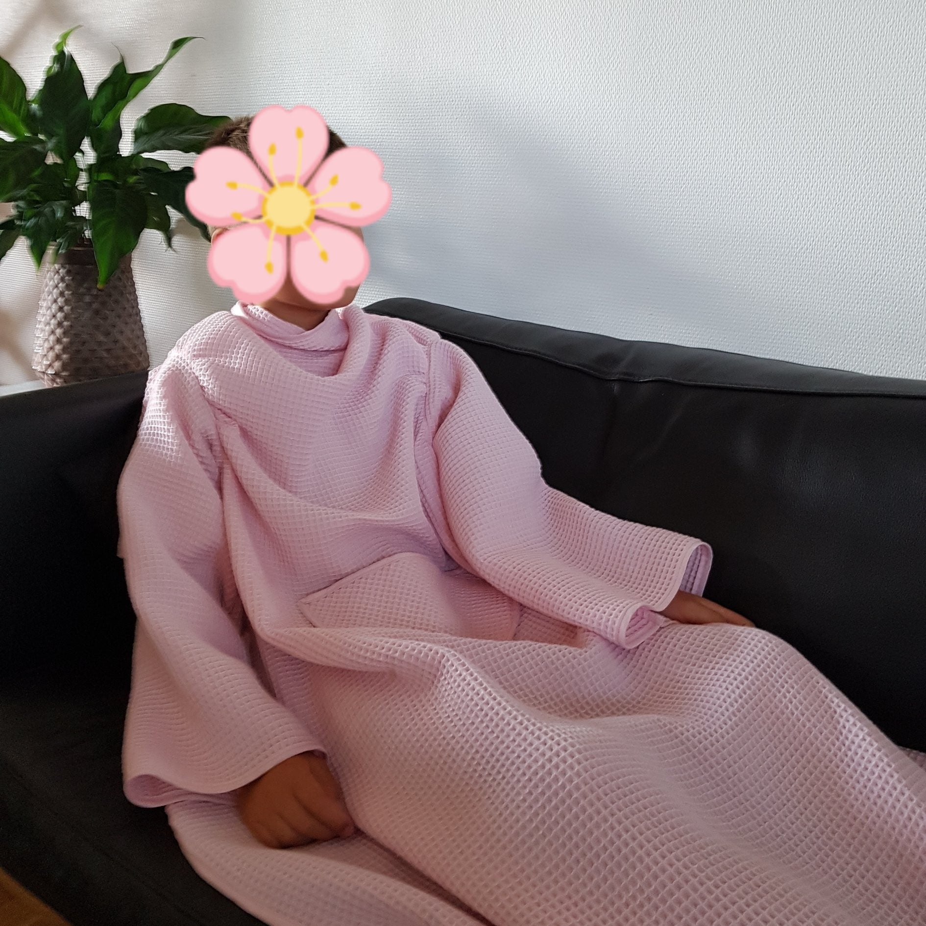 By DEE håndlavet hyggetæppe med ærmer og en lomme.