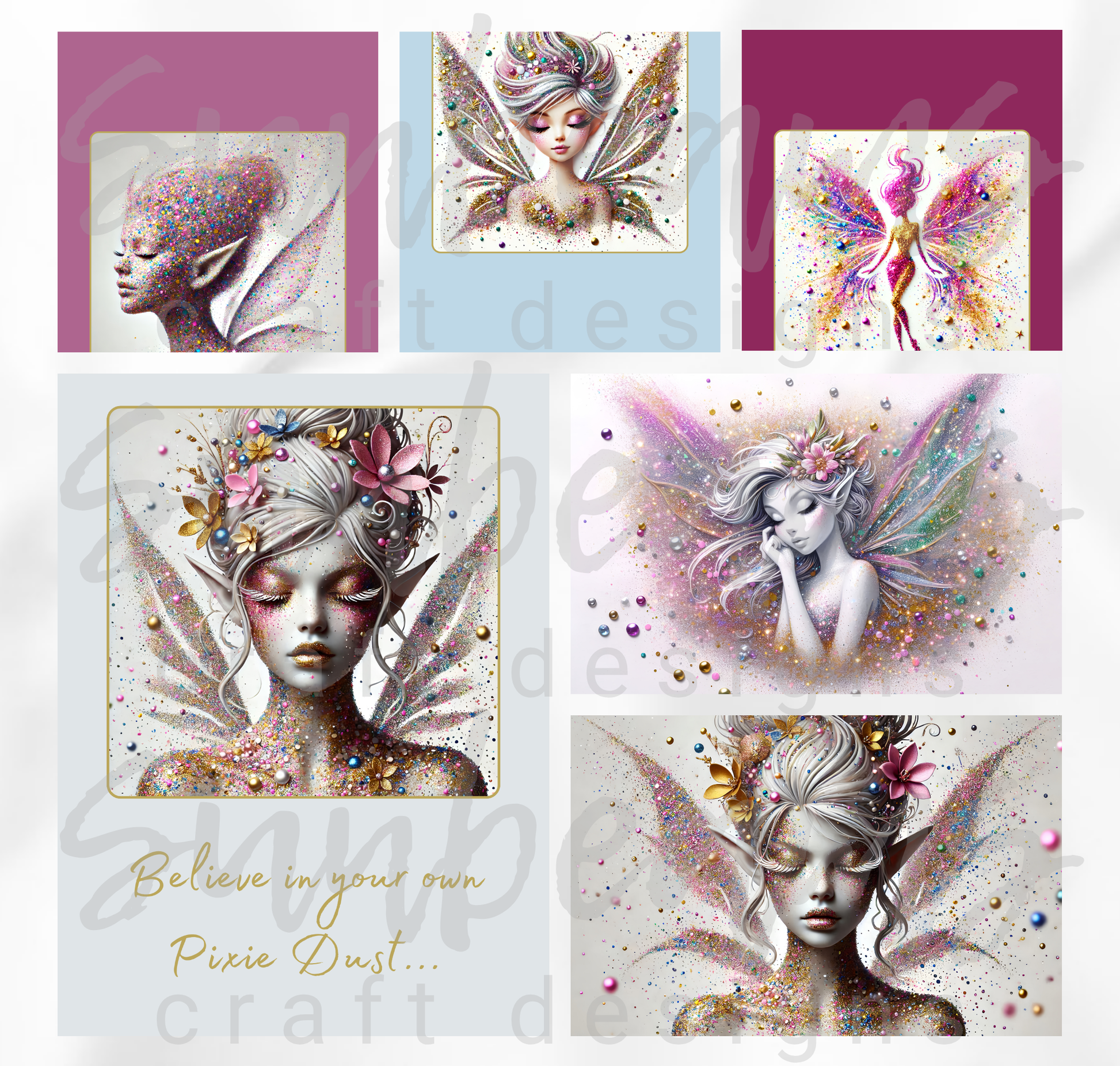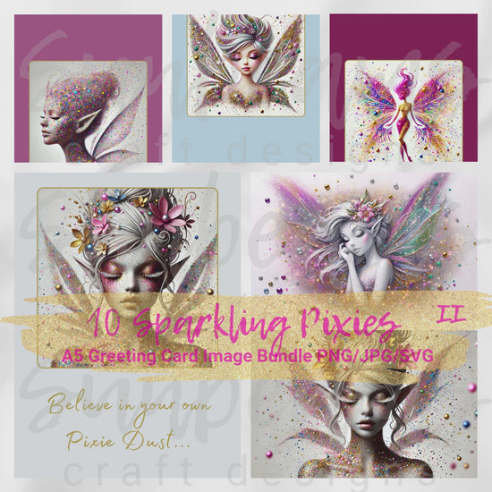 Introducing my “10 Sparkling Pixies II - A5 Greeting Card Image Bundle“ - a unique, elegant and sparkling collection of 21 high-quality digital images for all PIXIE & GLITTER LOVERS! These popular A5 designs are perfect for adding a touch of enchantment, fantasy and glitter to your greeting cards or scrapbooking projects.