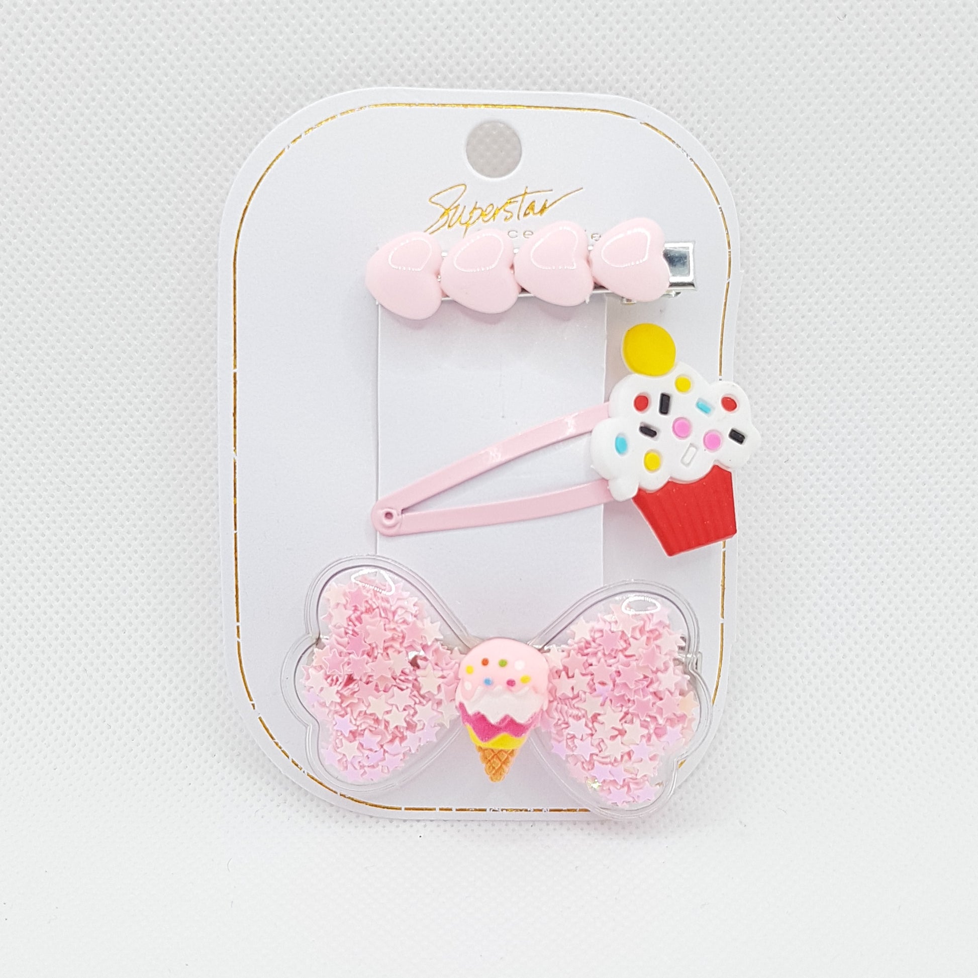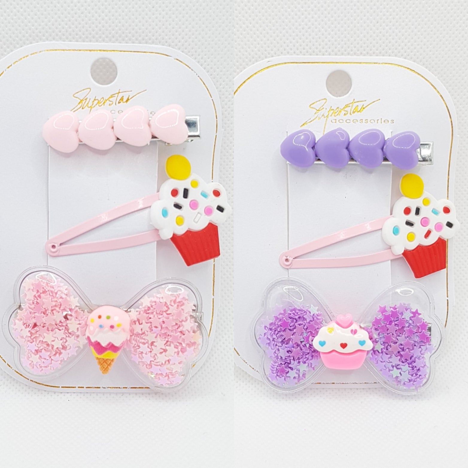 MEGA cute cupcake og is hårklemmer. 3 forskellige - pyntet med hjerter, cupcakes, isvaffel samt en sløjfeformet shaker fyldt med glitrende stjerne-konfetti.