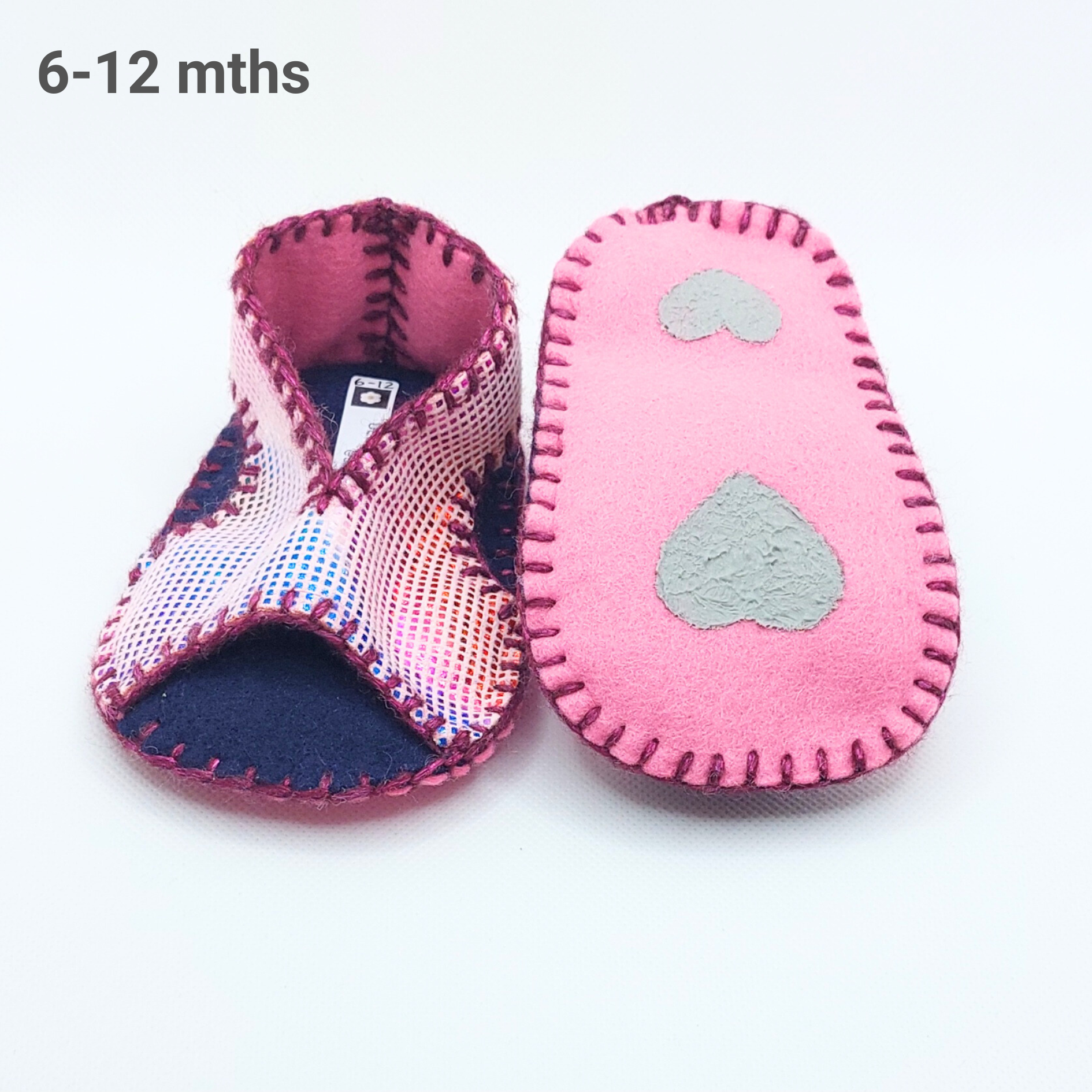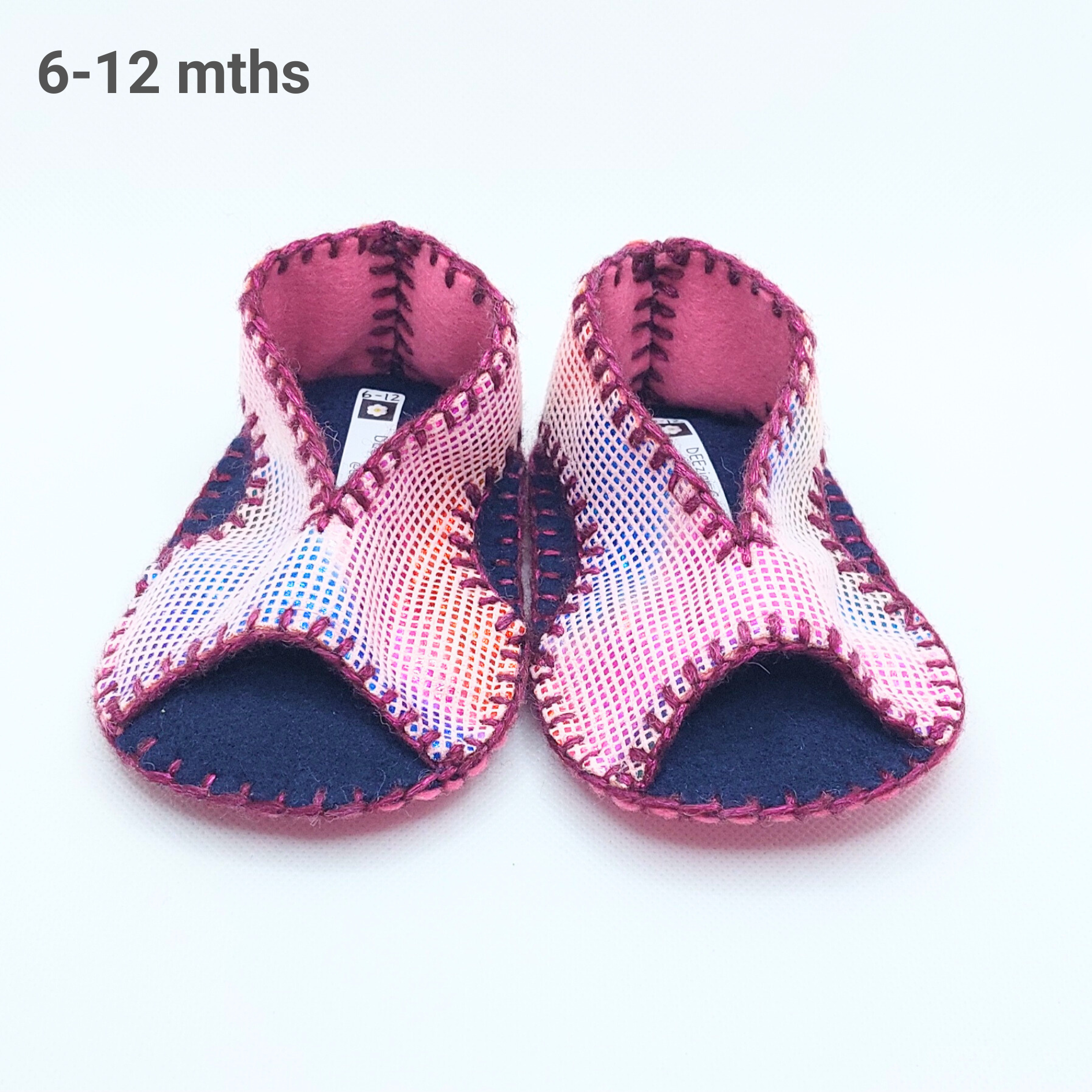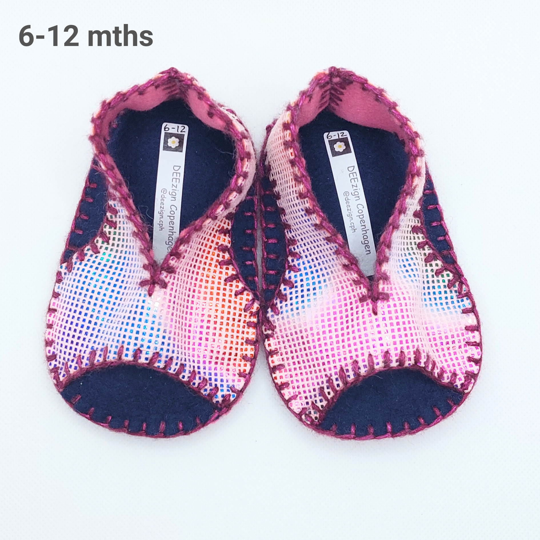 Funky og søde håndsyede uldne sutsko i en farveblanding af regnbue, mørkeblå, mørkerød og pink nuancer.