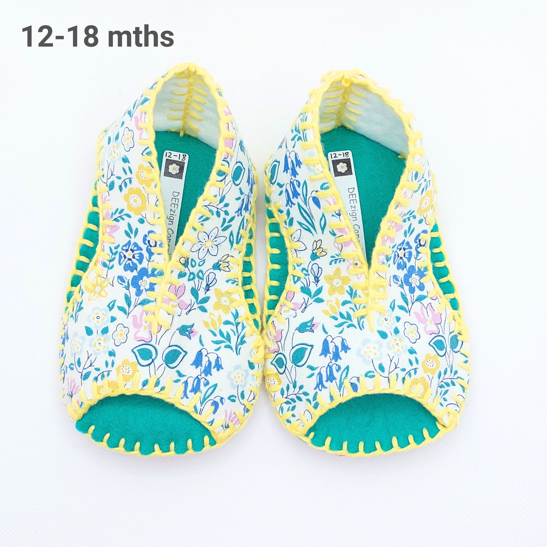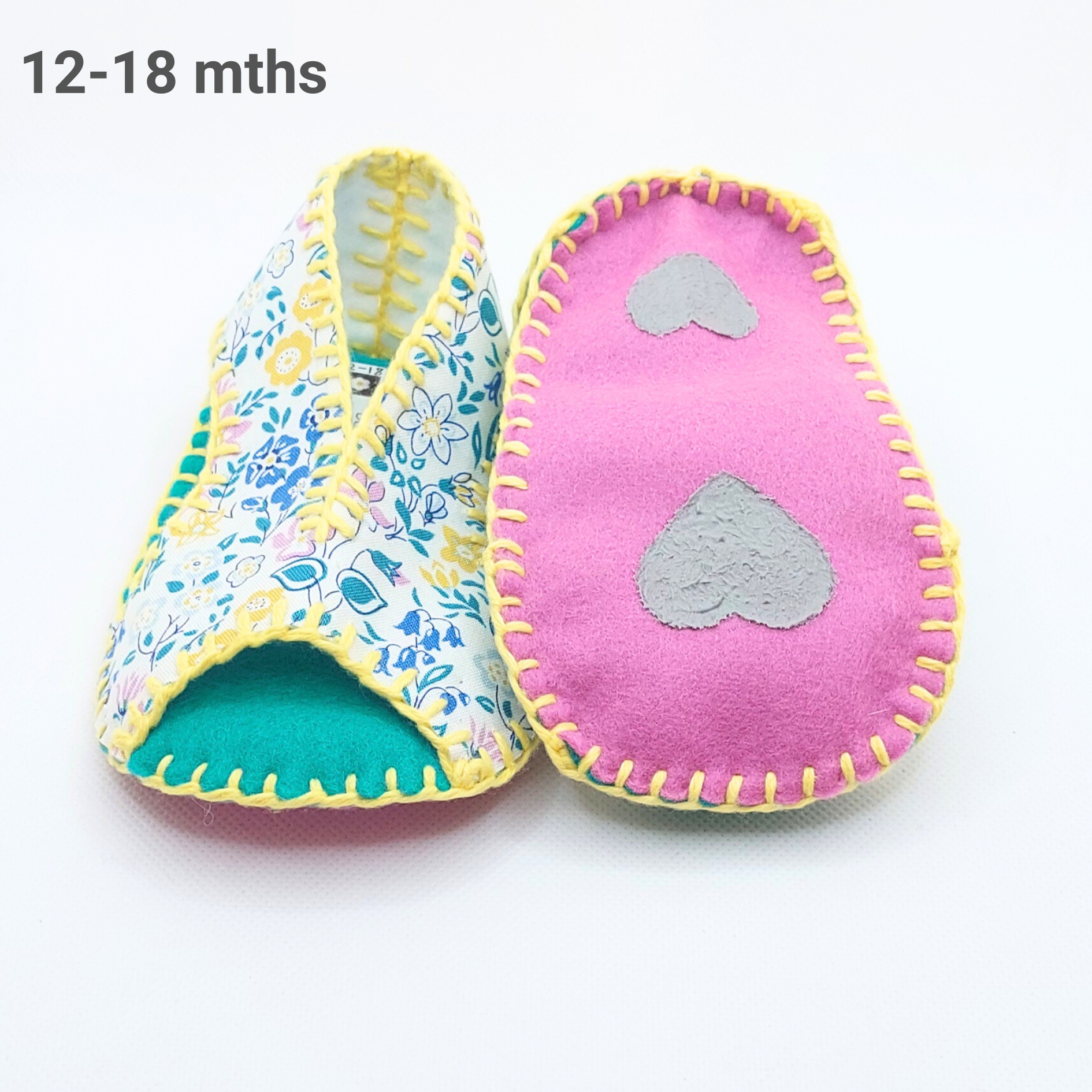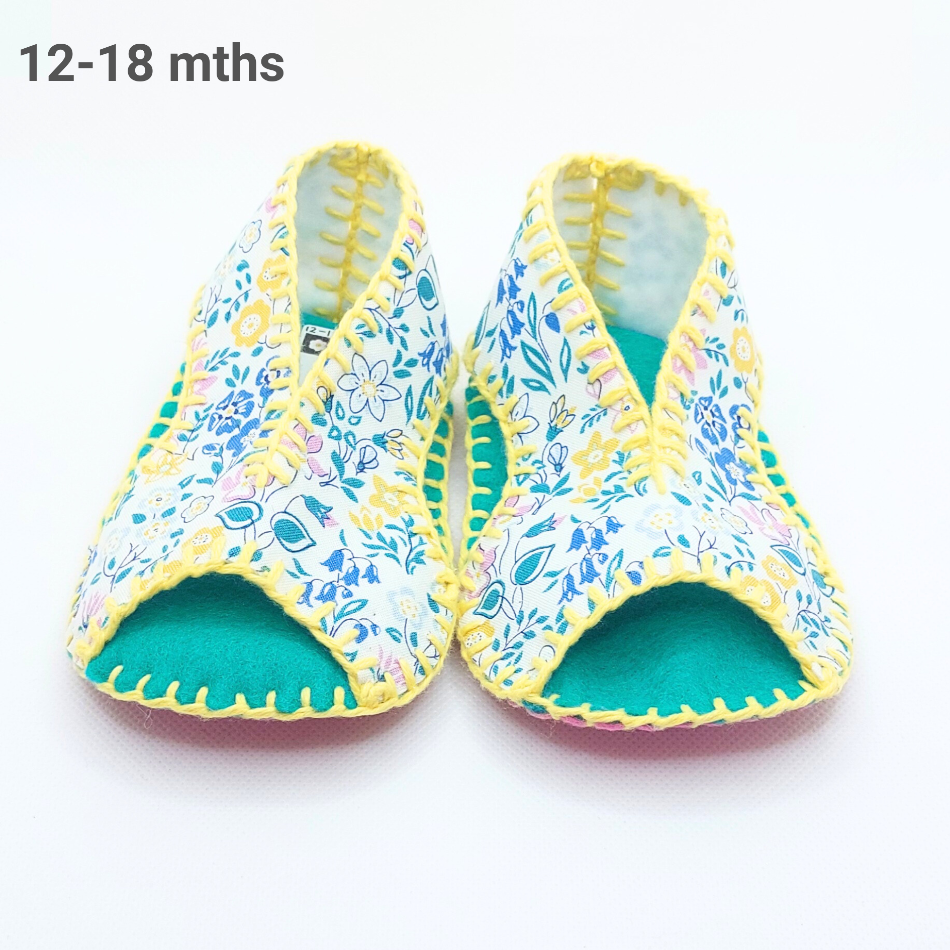 Smuk & søde håndsyede uld sandaler sutsko i en blomstrende blanding af lilla, gule, blå, grønne og hvide nuancer.