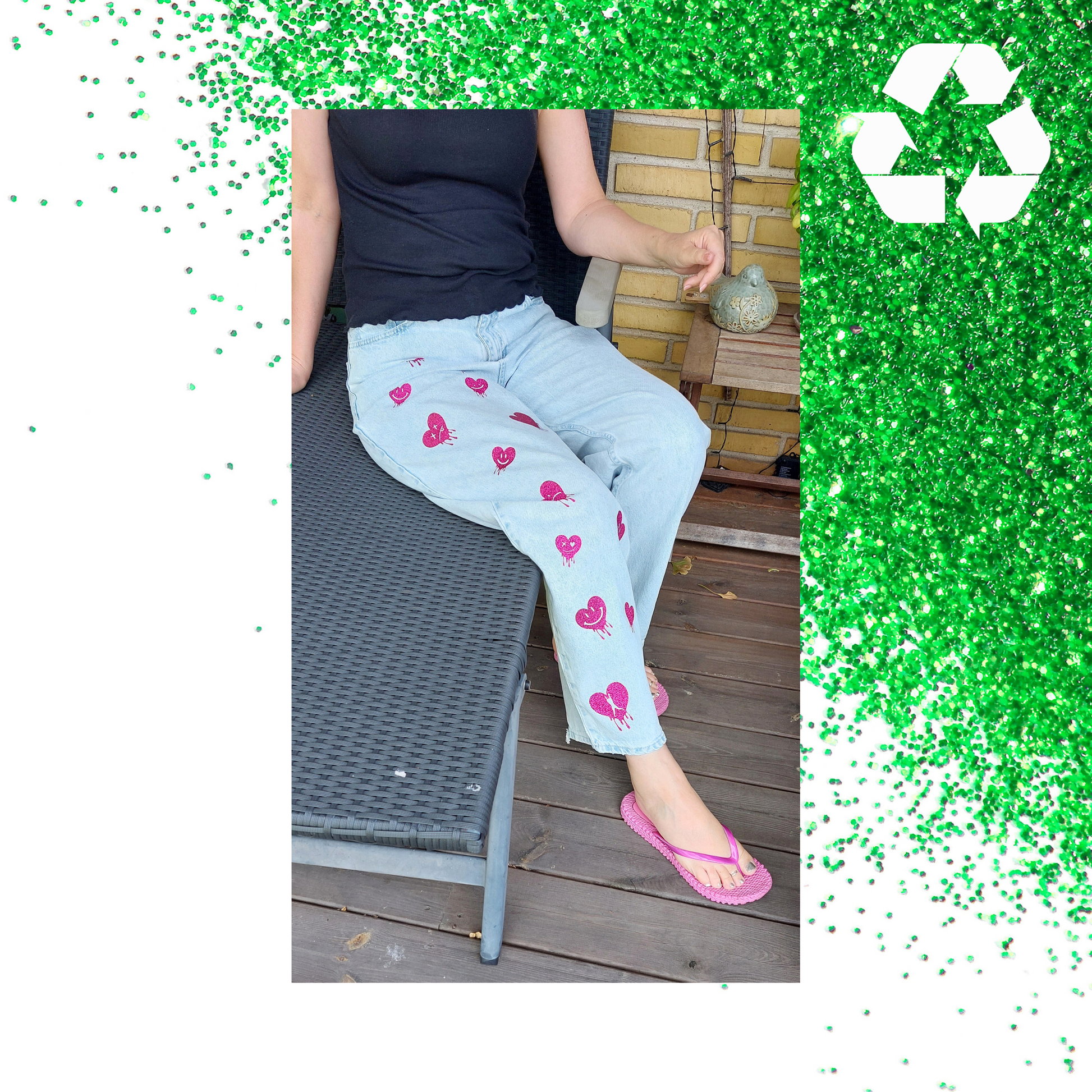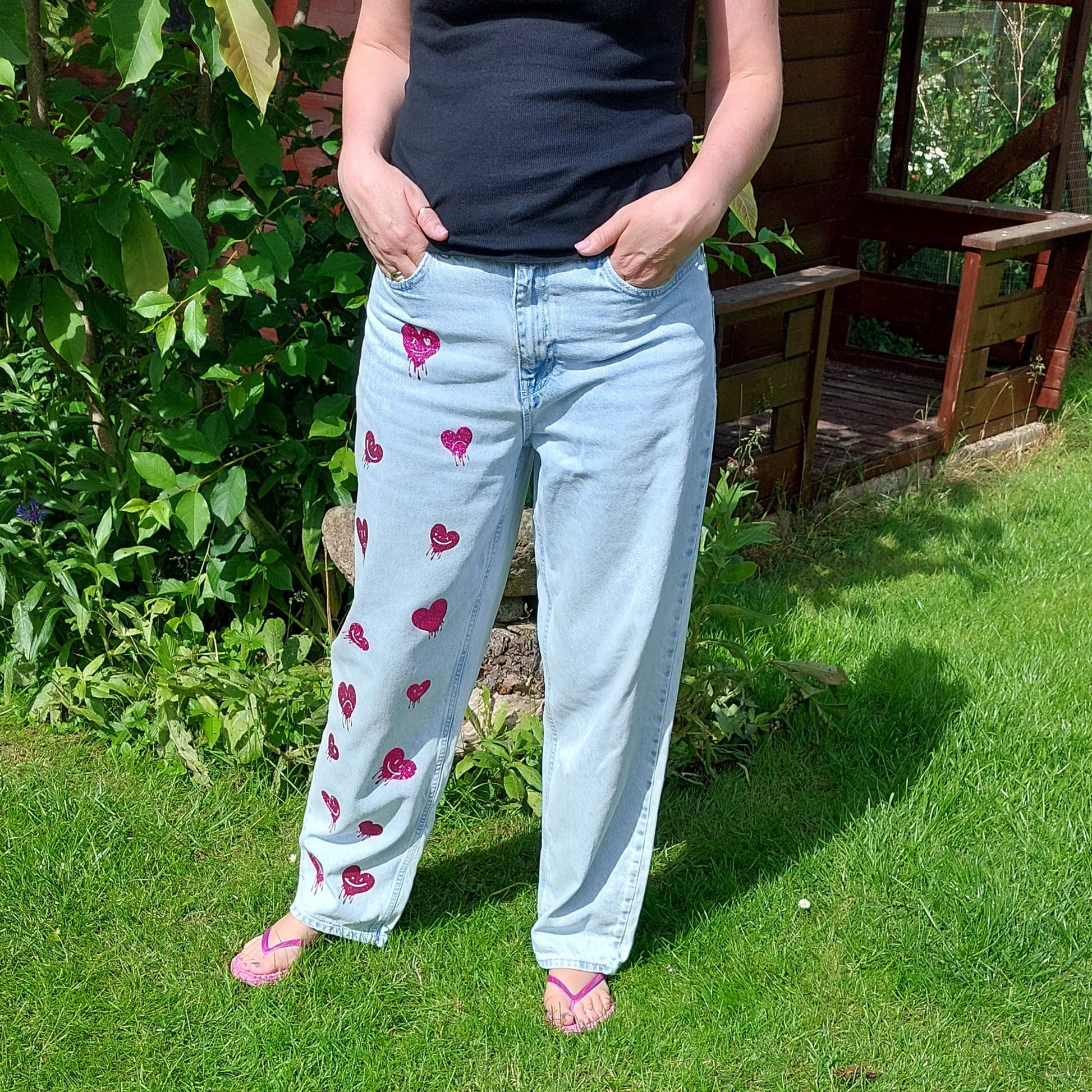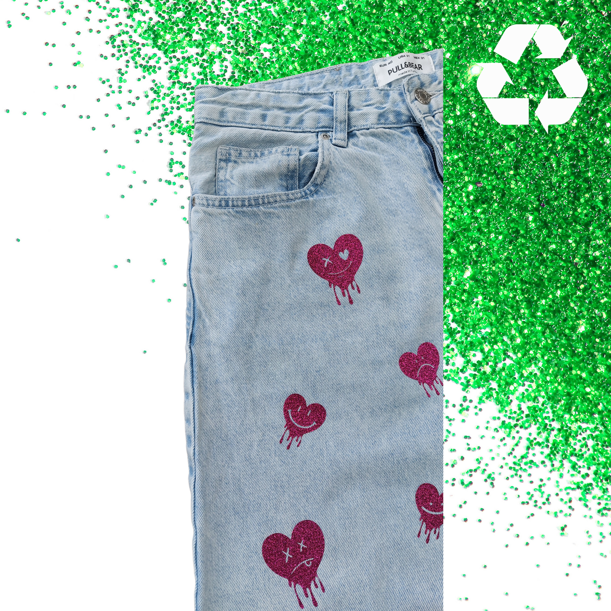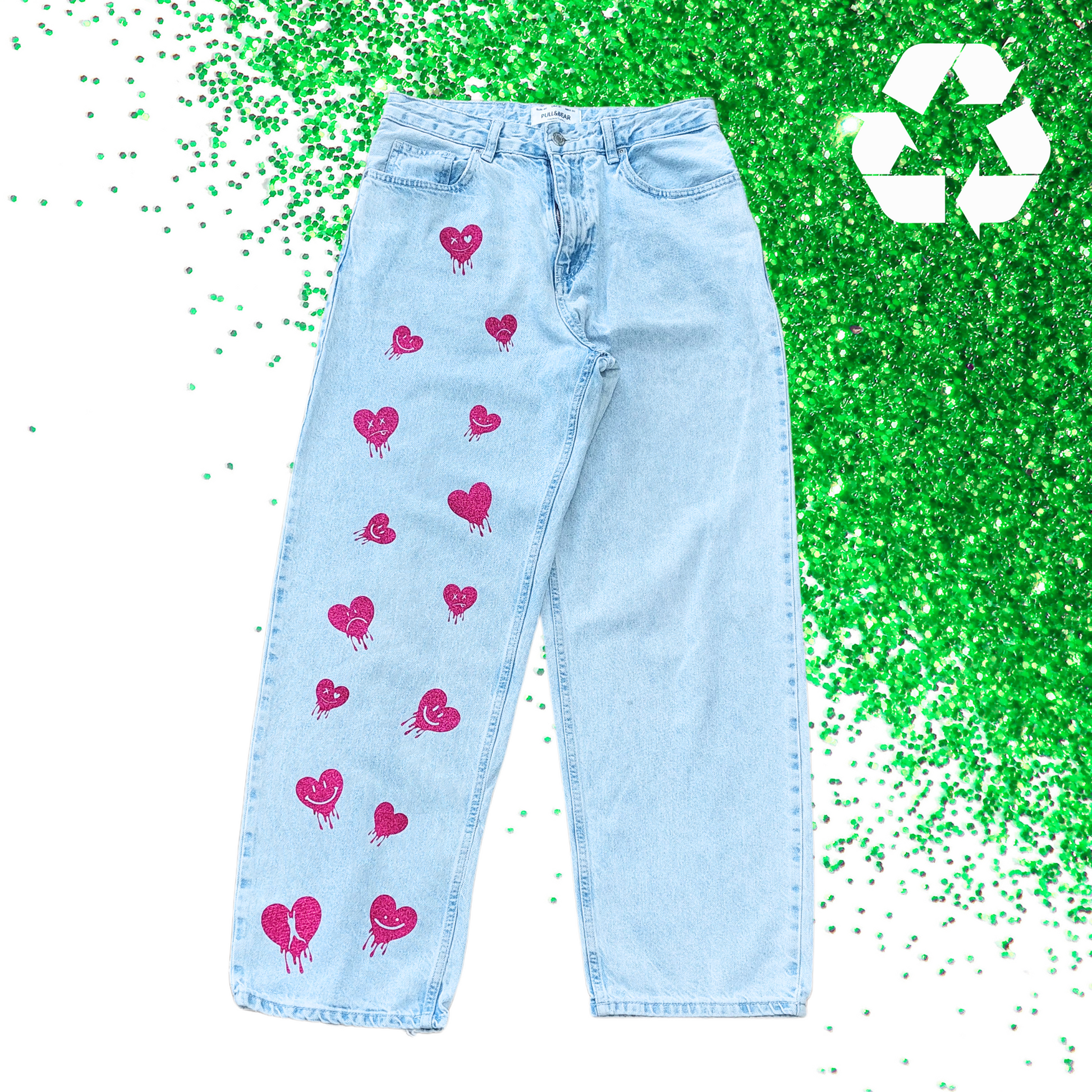 Wear the LOVE! upcycled: Disse stilfulde unisex PULL&BEAR baggy fit-jeans er velegnede til drippy teenagere, der elsker glitter og hjerter!