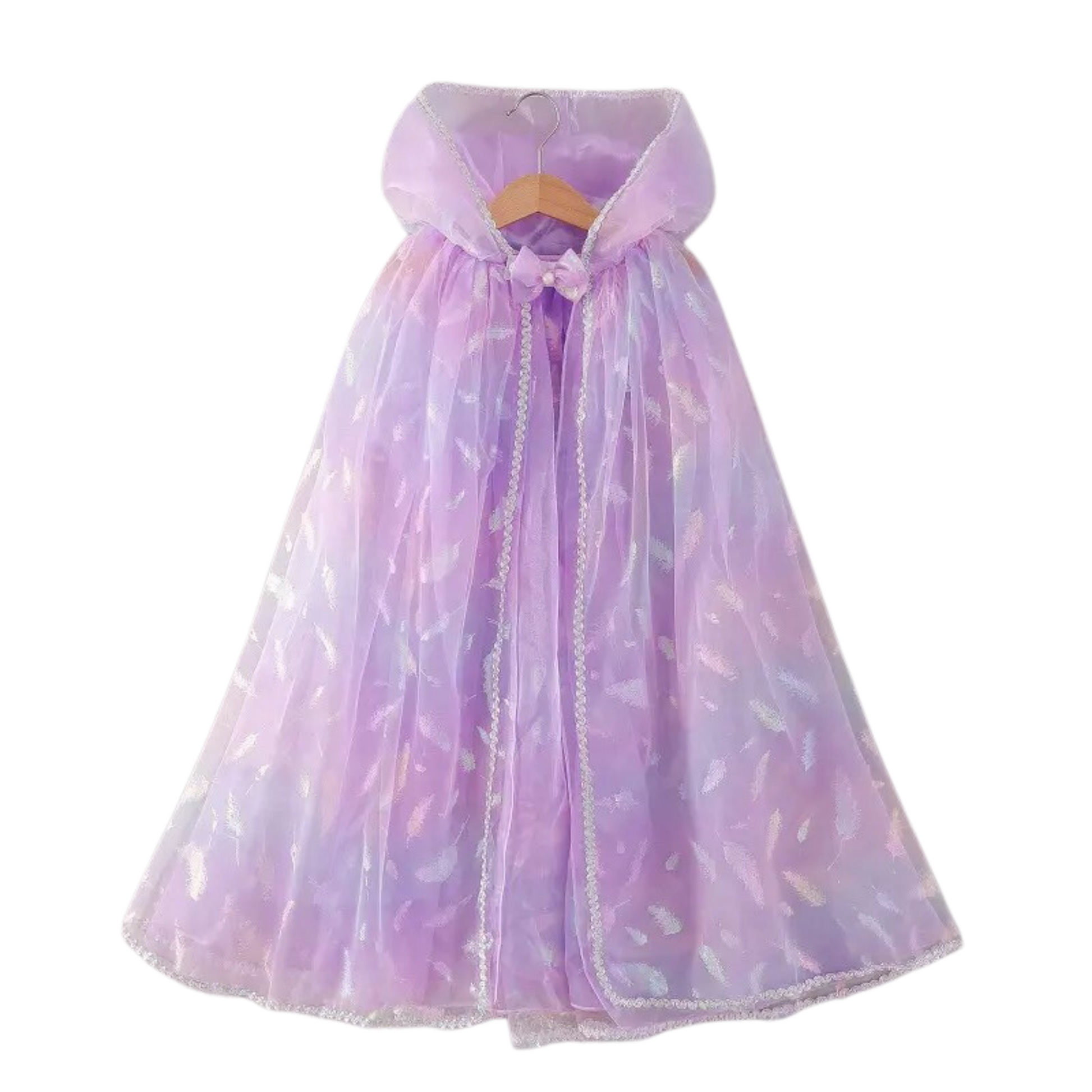 Den fortryllende kappe har en fin hætte og er pyntet med motiver af glitrende regnbuefarvede fjer.