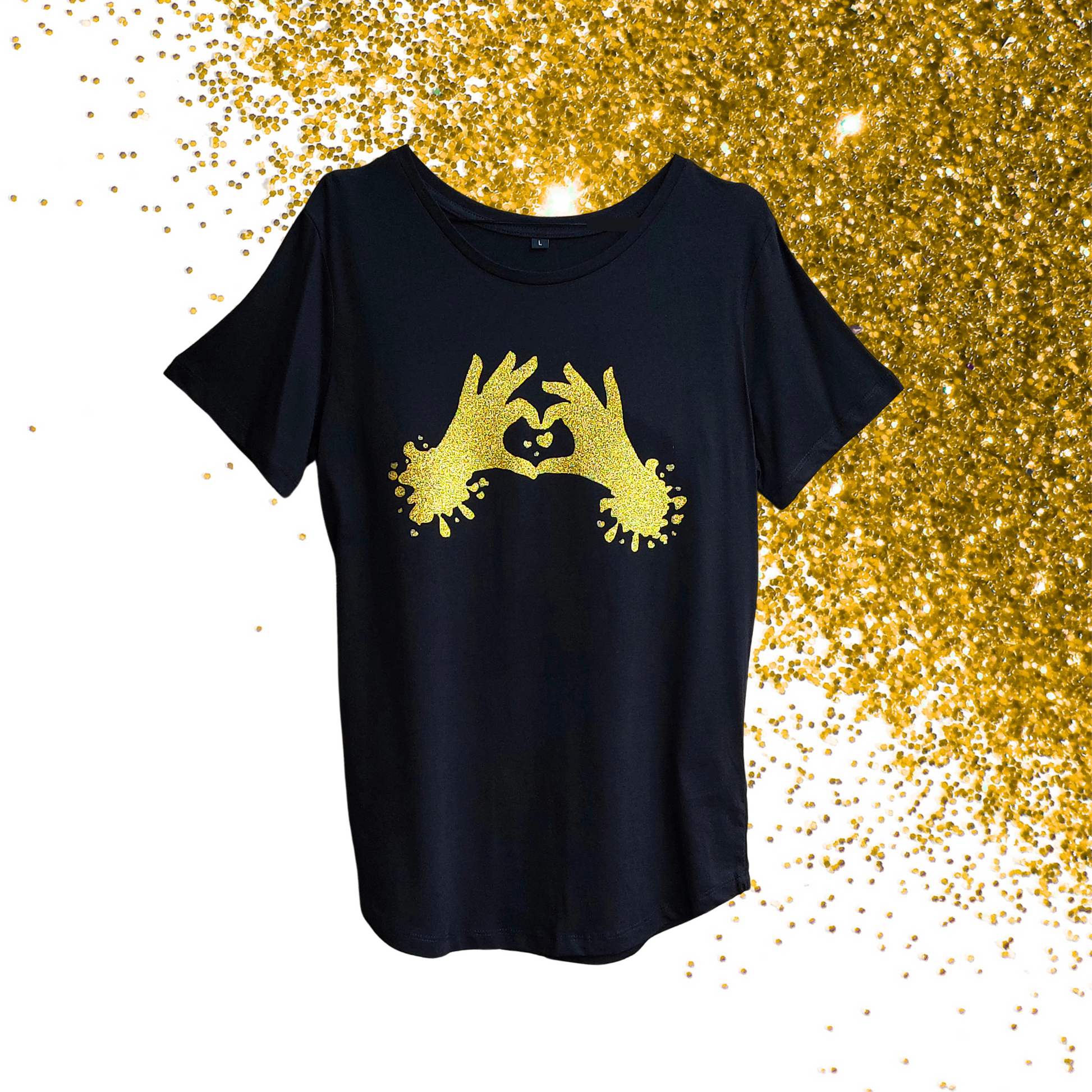 Large - Round Hem Tee - Heart Hands - Glimmer: guld