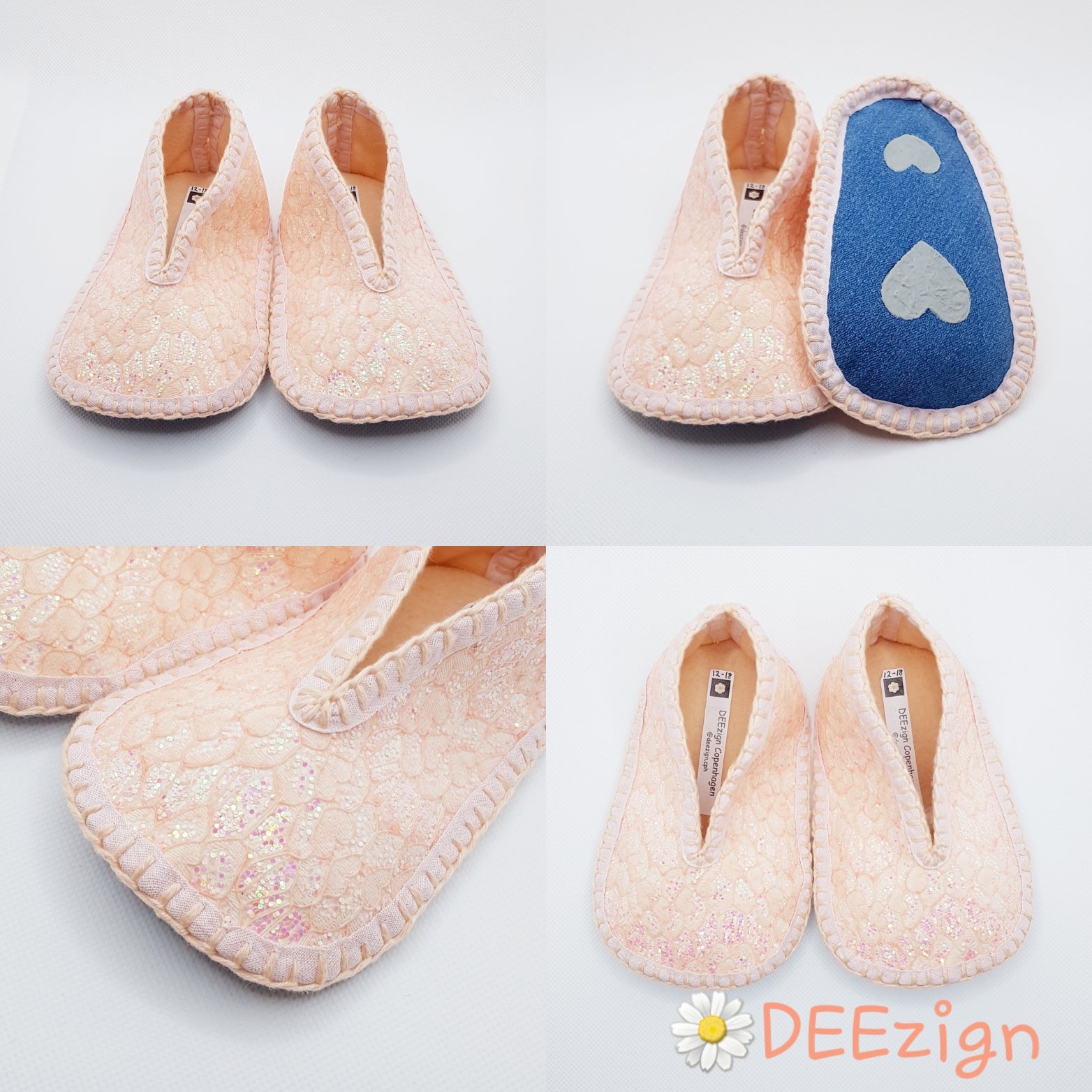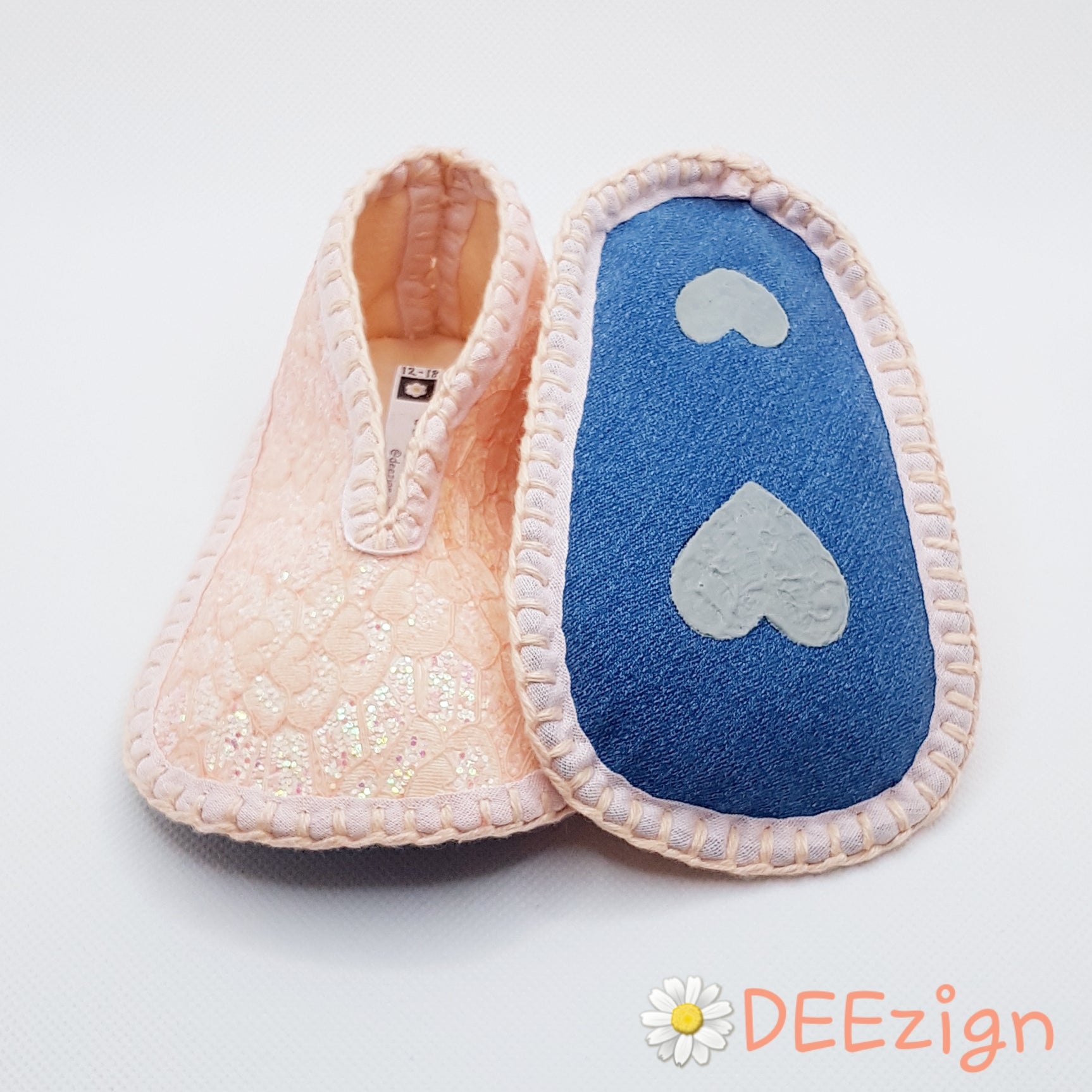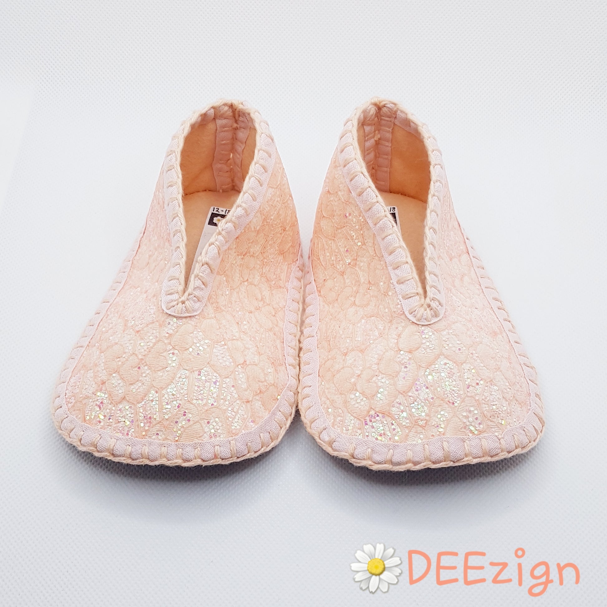 Lækker håndsyede blonde & glimrende baby sutsko i en farveblanding af baby pink & fersken nuancer.