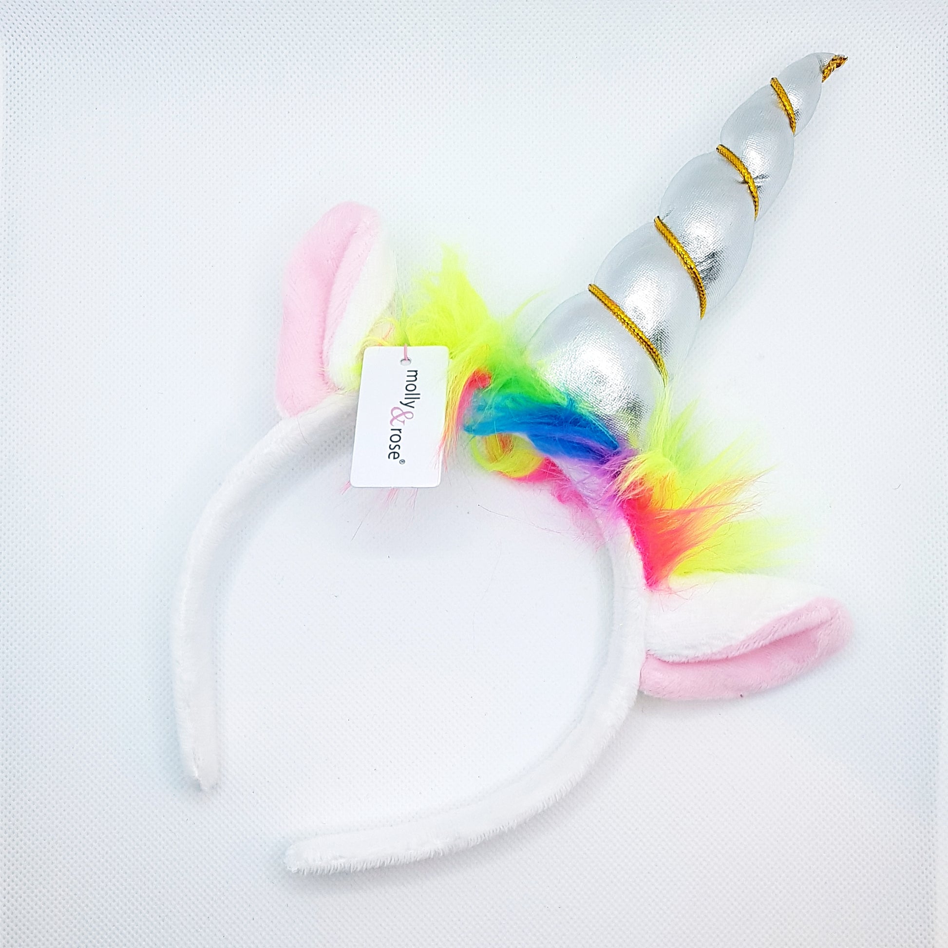 Molly & Rose hårbøjle med sølvfarvet enhjørning horn, ører og regnbuefarvet pels og pandehår.