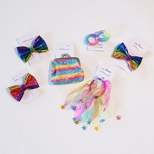 Farverige og fine hårklemmer fra det populære UK mærke - Molly & Rose. Kan bruges sammen med vores andre glitter og regnbue produkter.