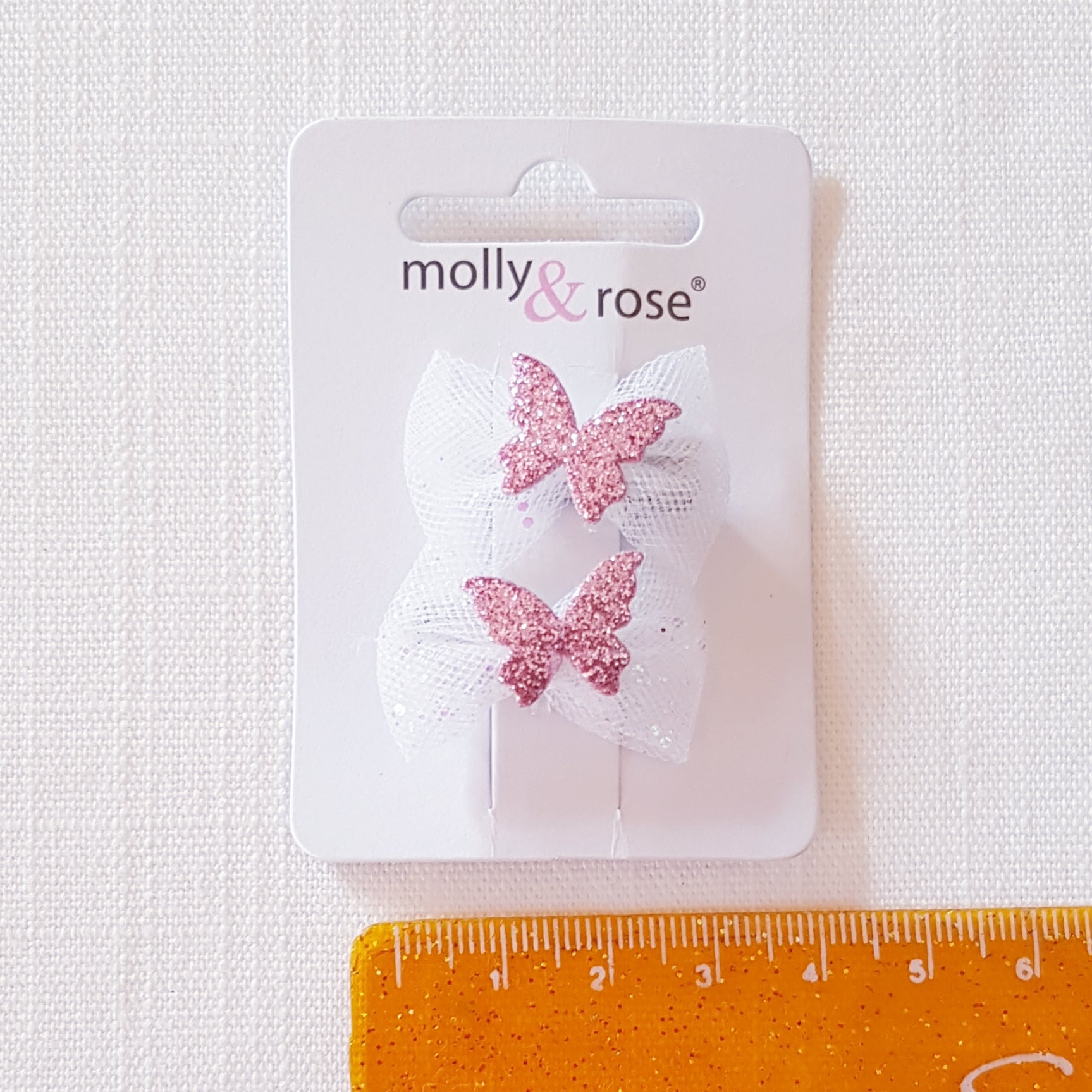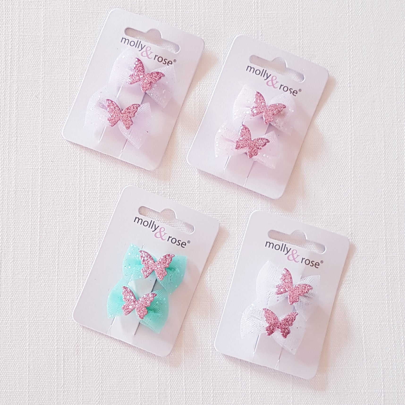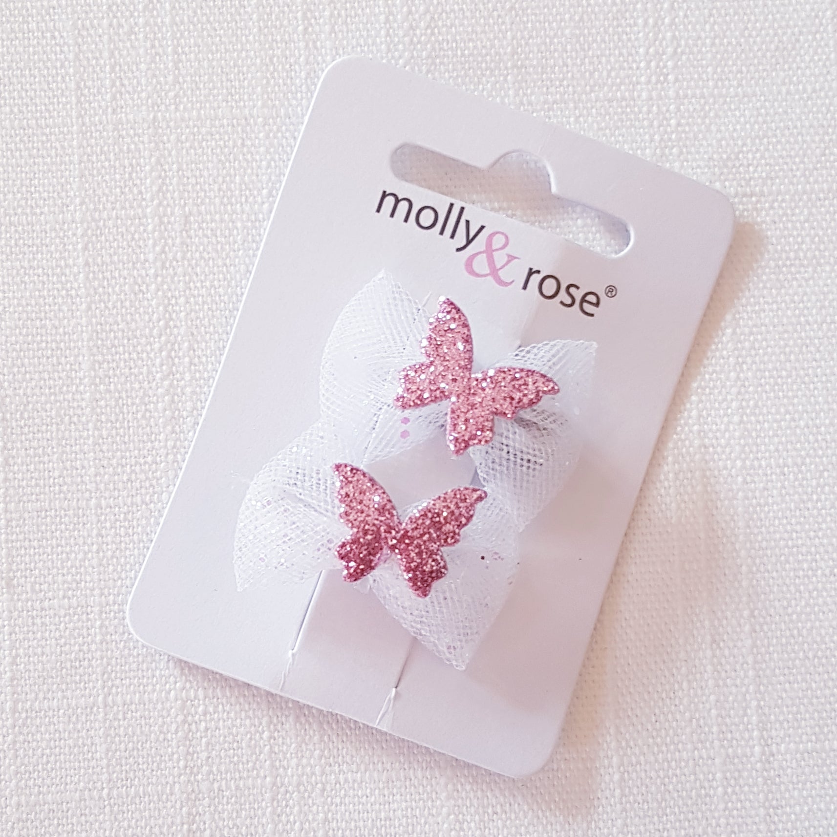 Molly & Rose hårklemmer med en net sløjfe og glimmer sommerfugl motiv.