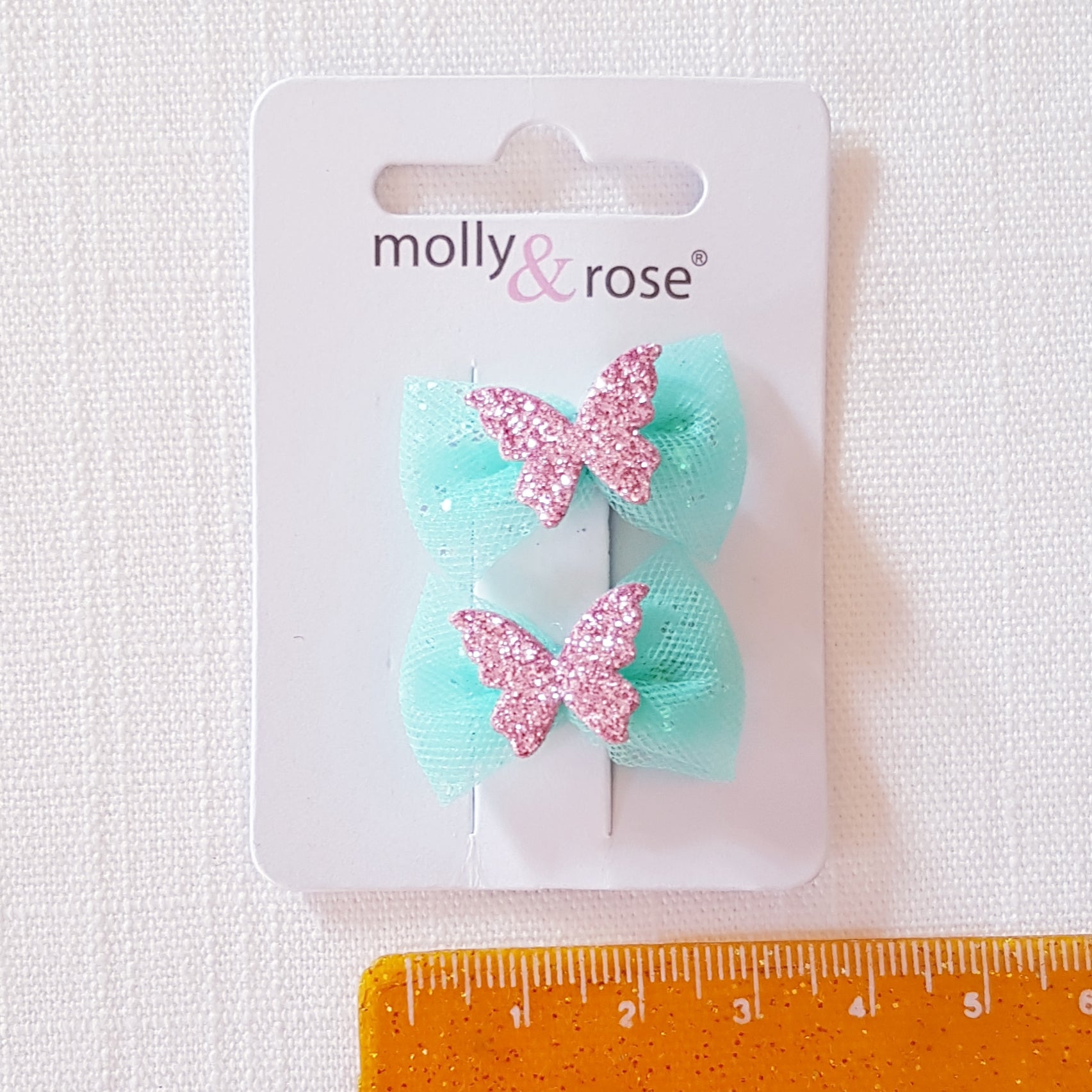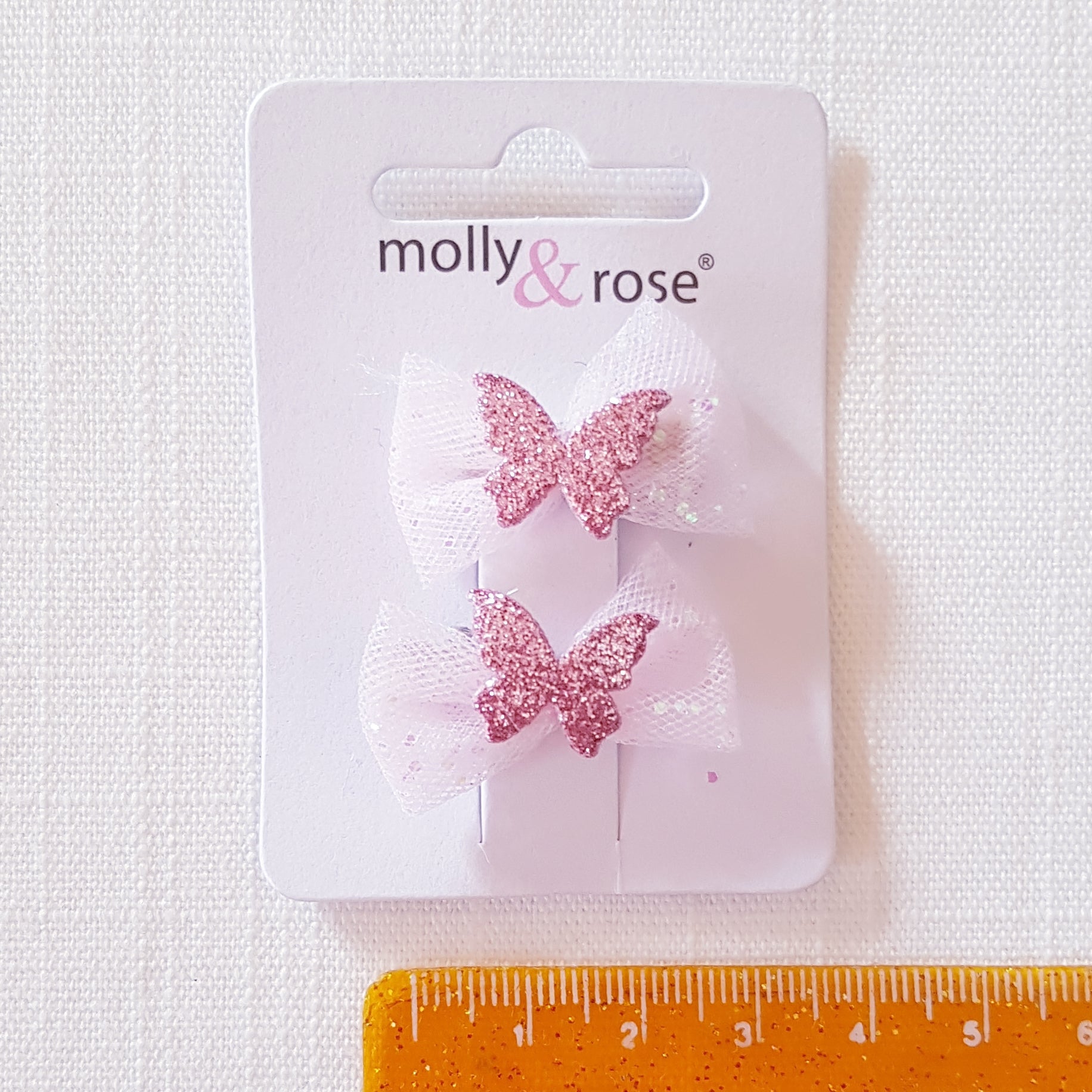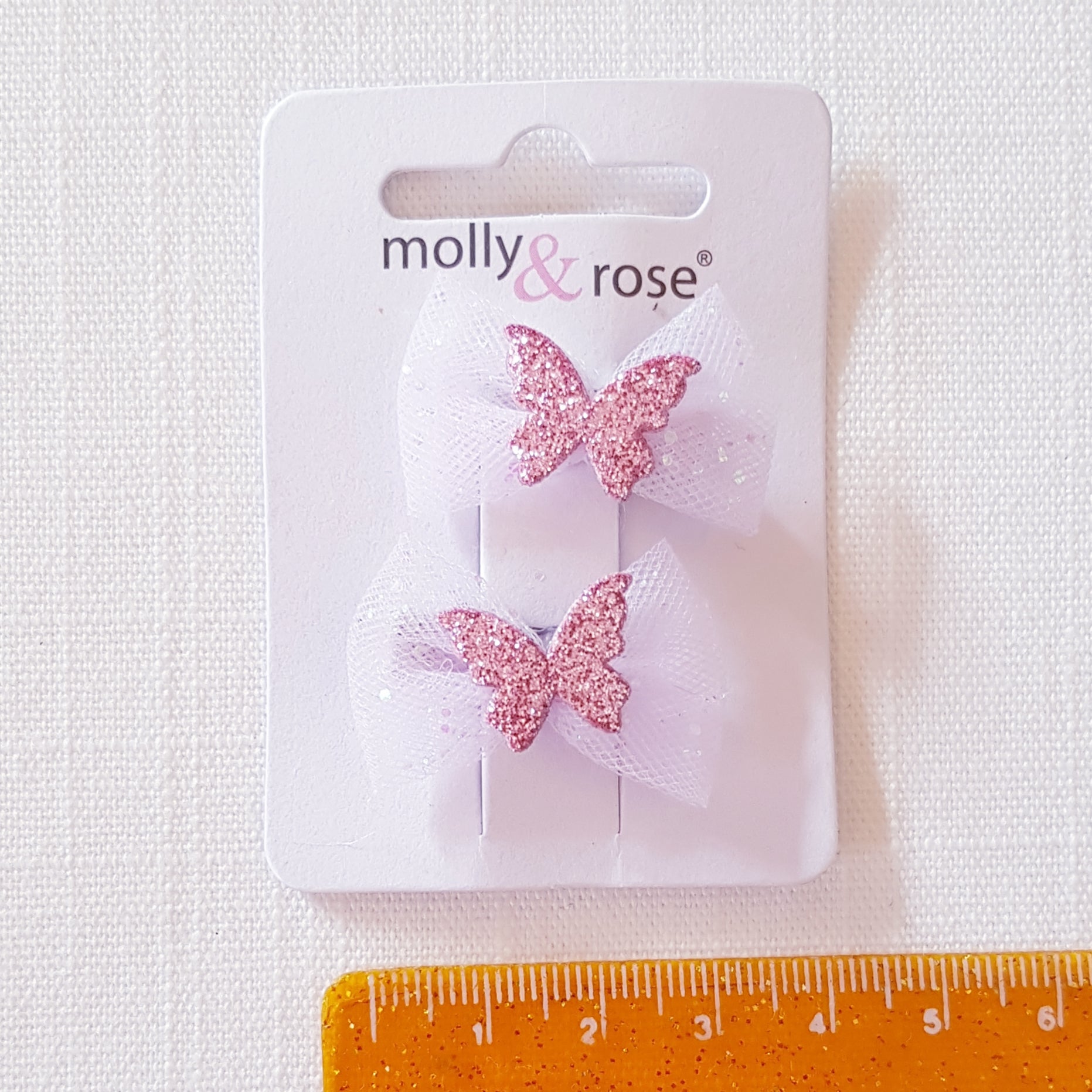 Molly & Rose hårklemmer med en net sløjfe og glimmer sommerfugl motiv.