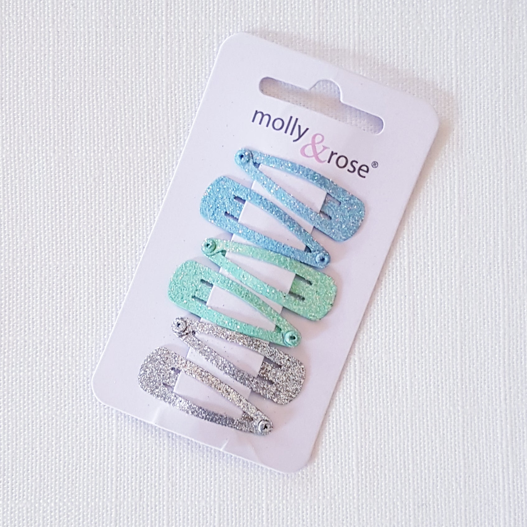 Molly & Rose hårklemmer i pastelfarvet glitter - 2x blå, 2x grøn og 2x sølvfarvet.