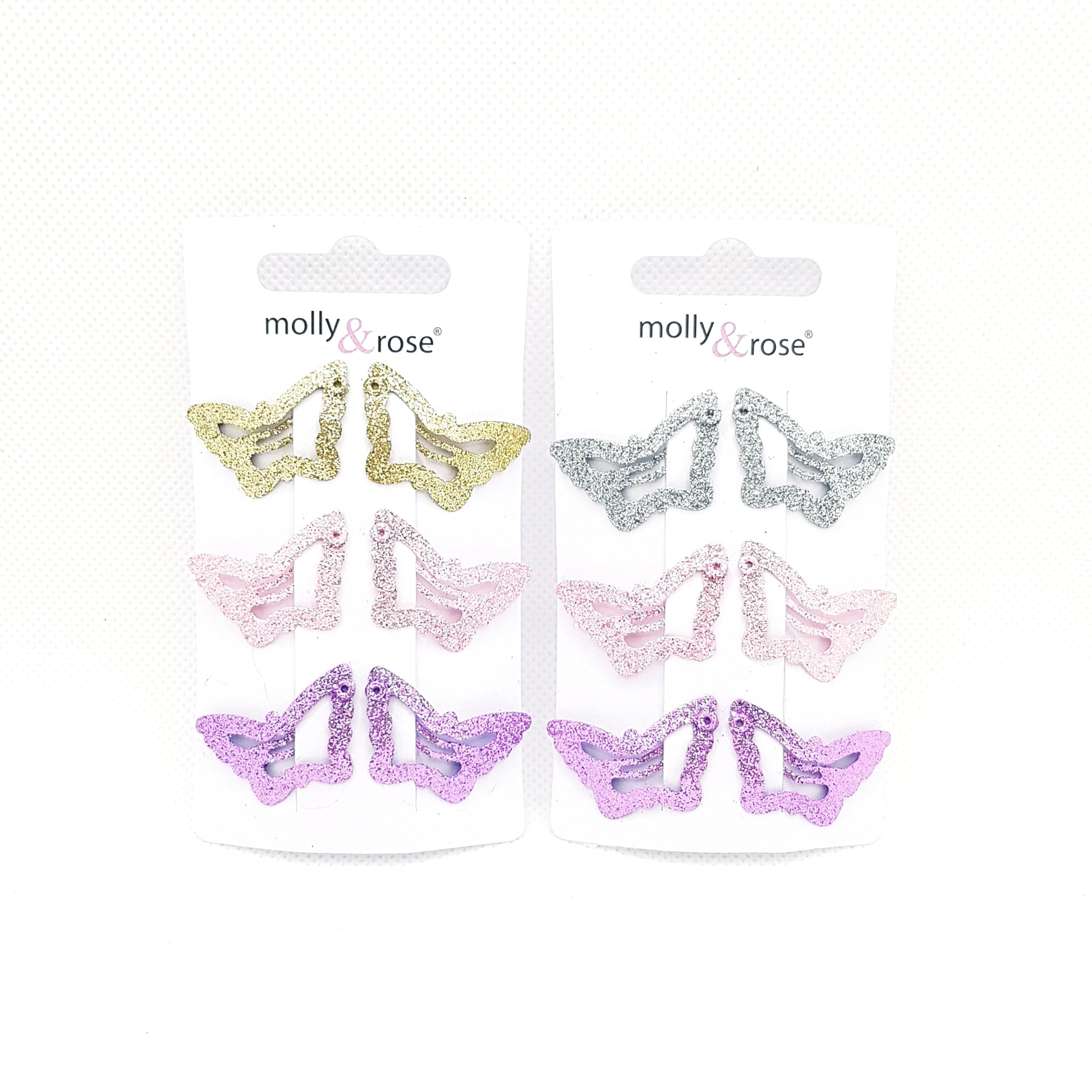 Molly & Rose sommerfugle hårklemmer pyntede med glimmer.