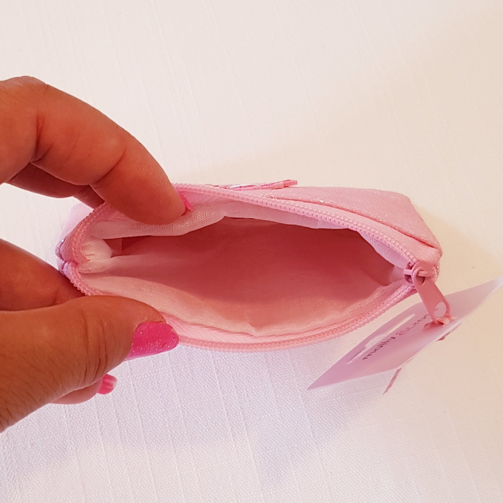 Molly & Rose pung til mønter i pink glitter frost-look. Pungen er foret og lukkes med lynlås.