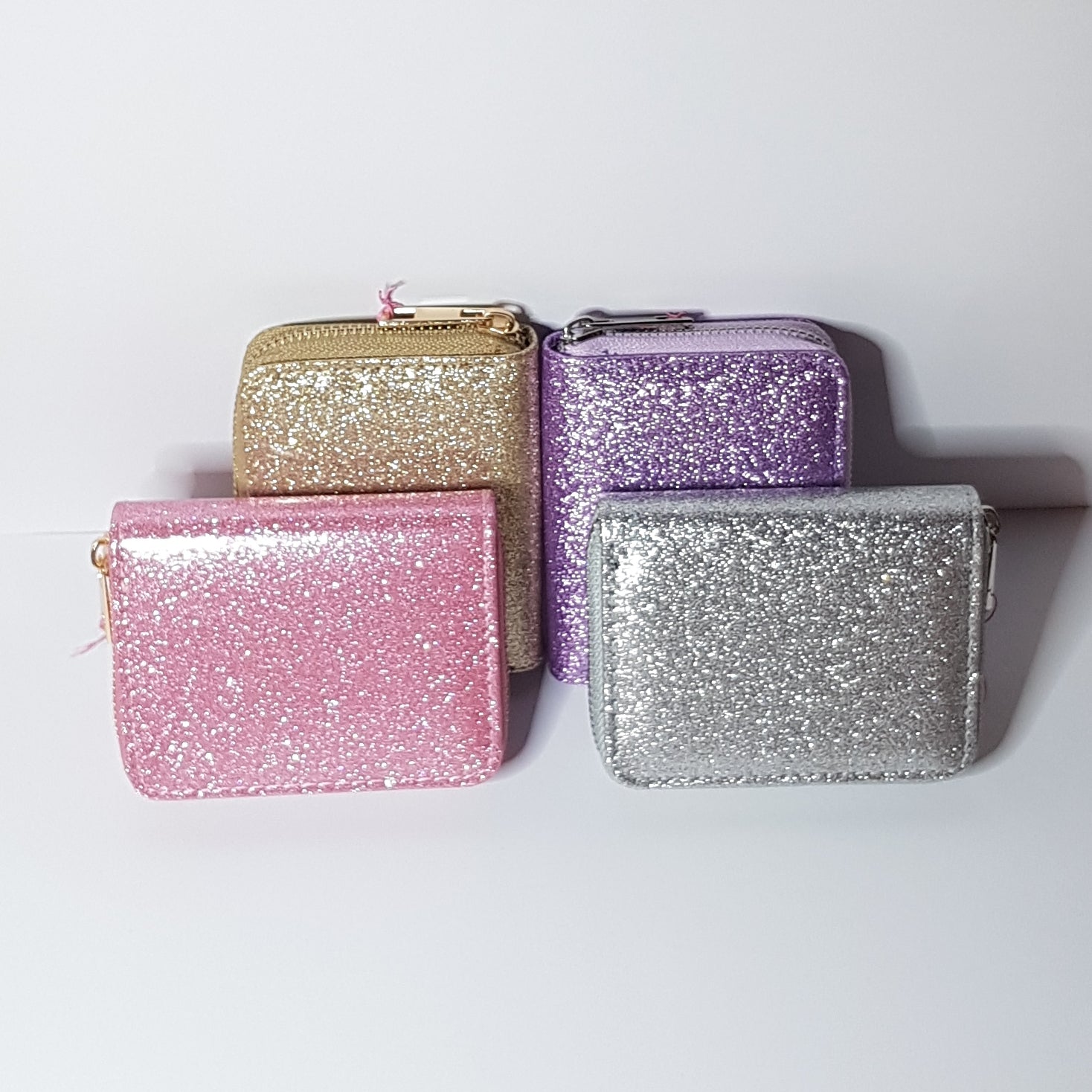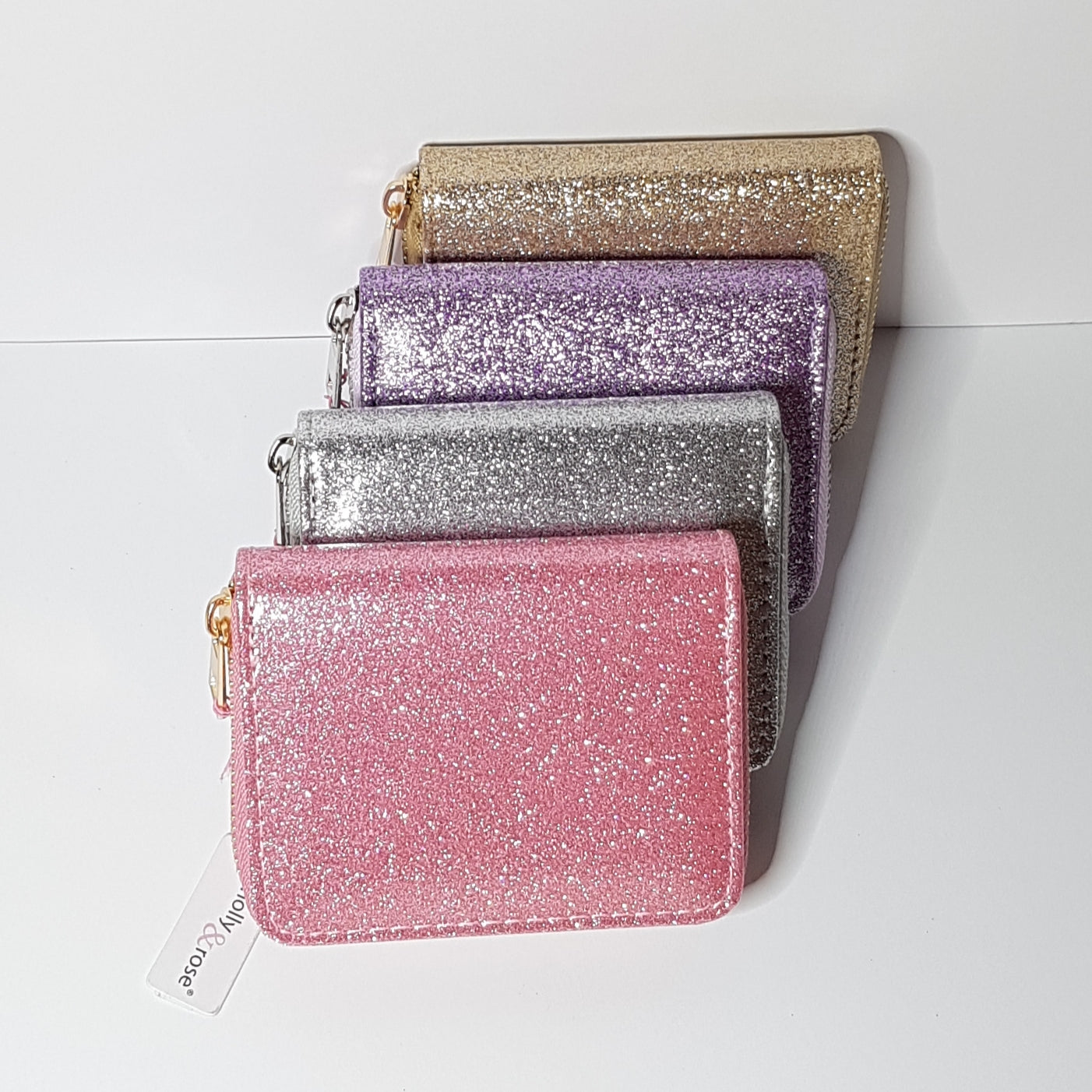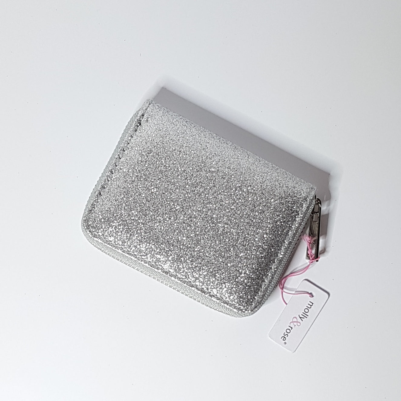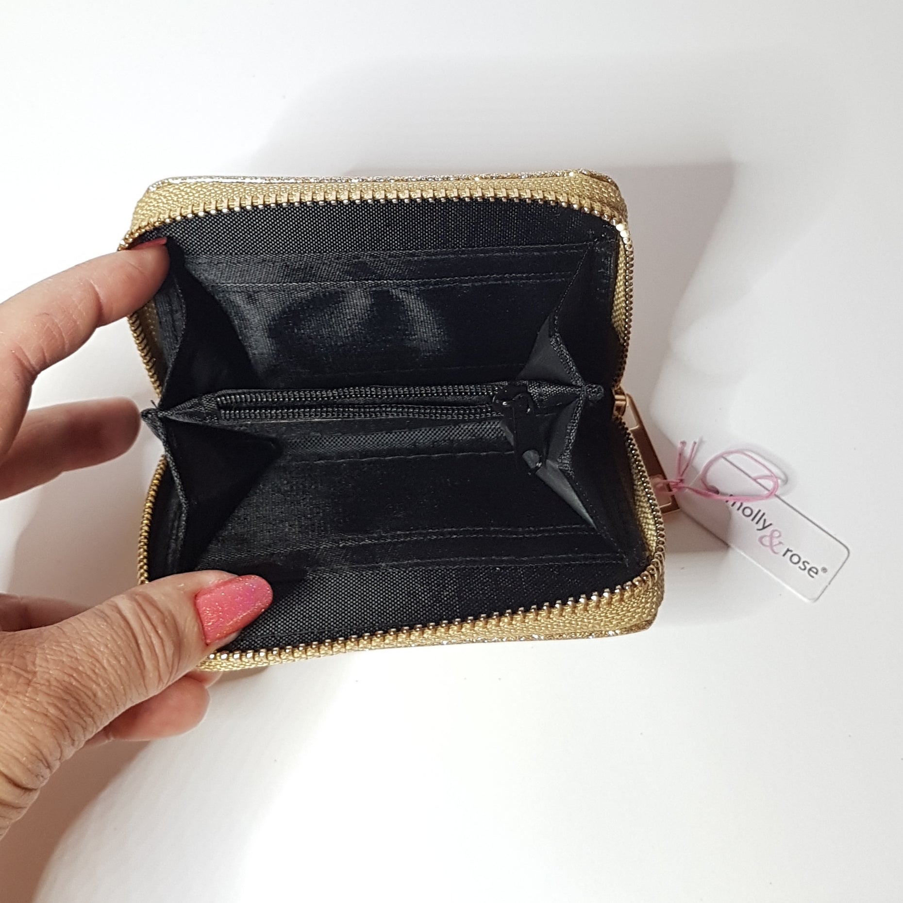Molly & Rose glimmer tegnbog til mønter, sedler og betalingskort. Pungen er sort invendigt og lukkes med lynlås.