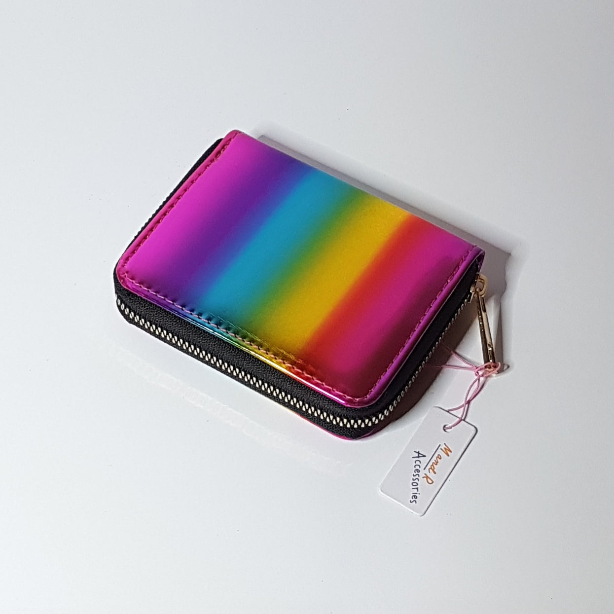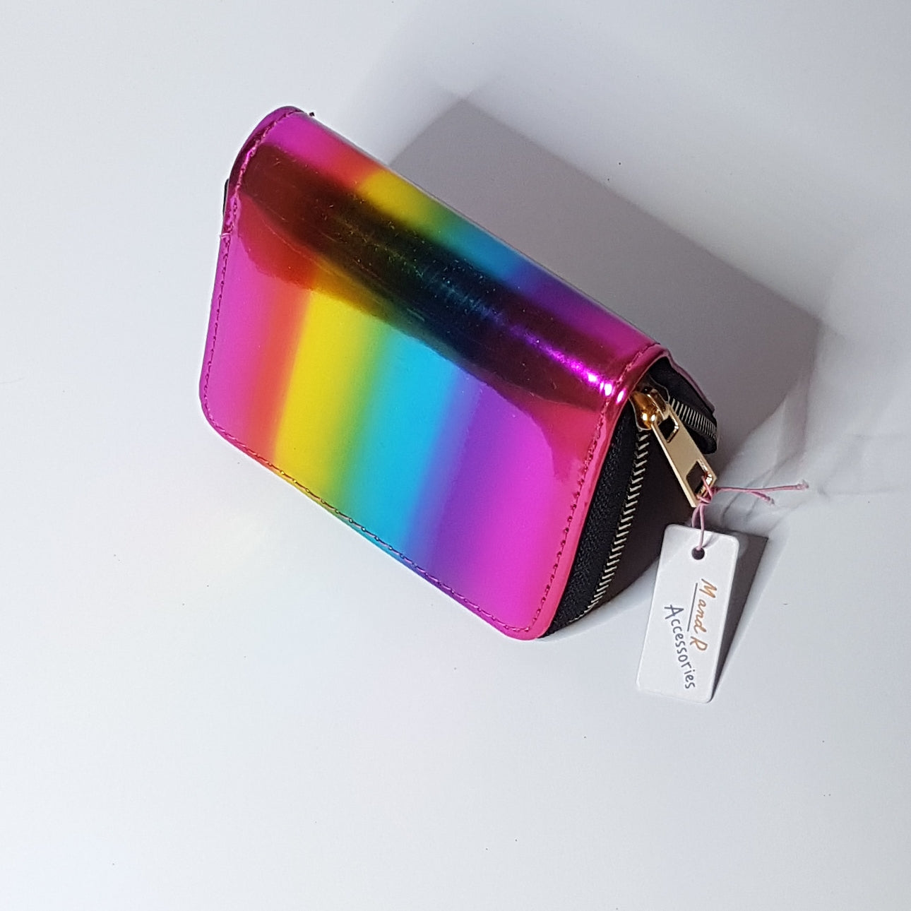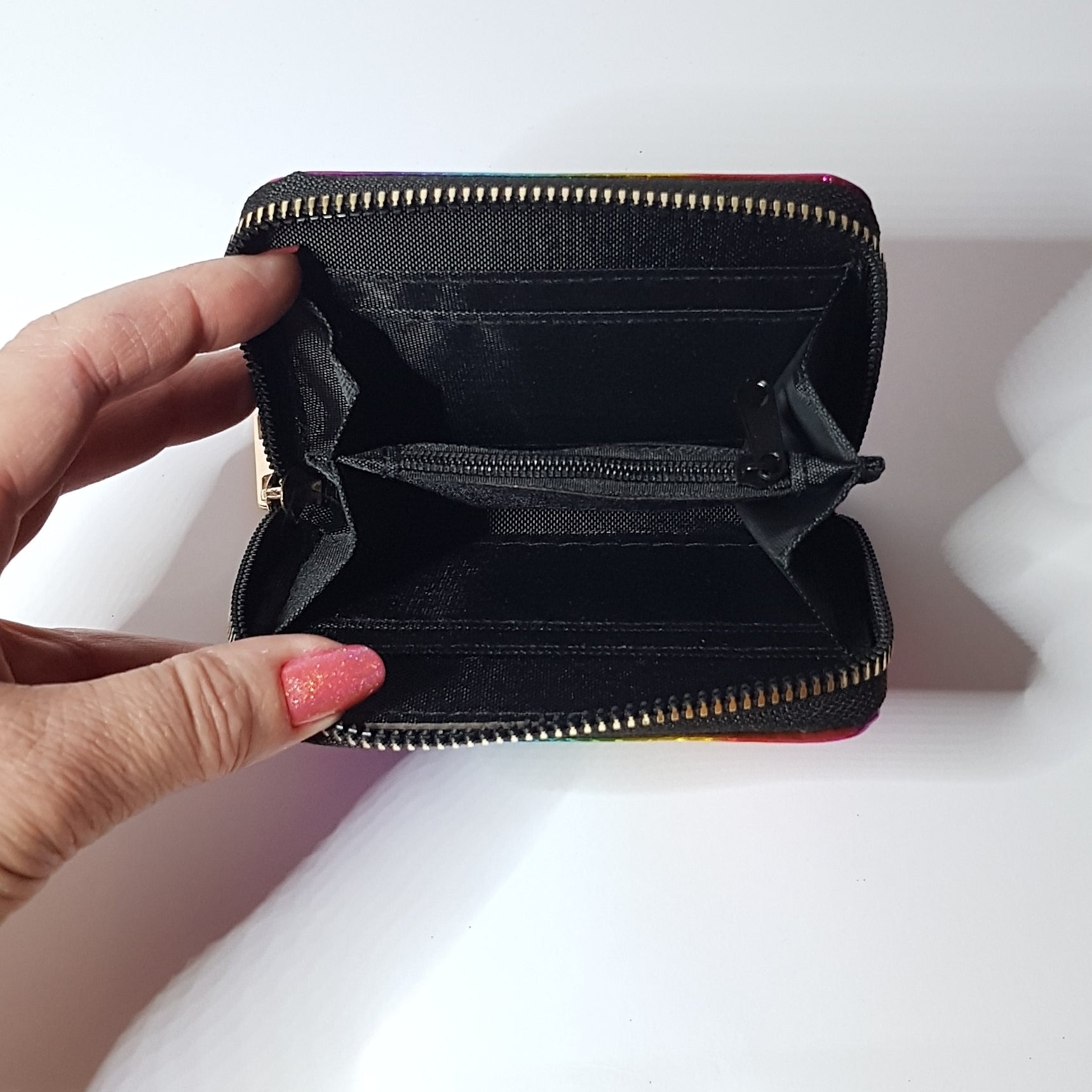 Molly & Rose tegnbog i metallisk regnbue-farverpung til mønter, sedler og betalingskort. Pungen er sort invendigt og lukkes med lynlås.