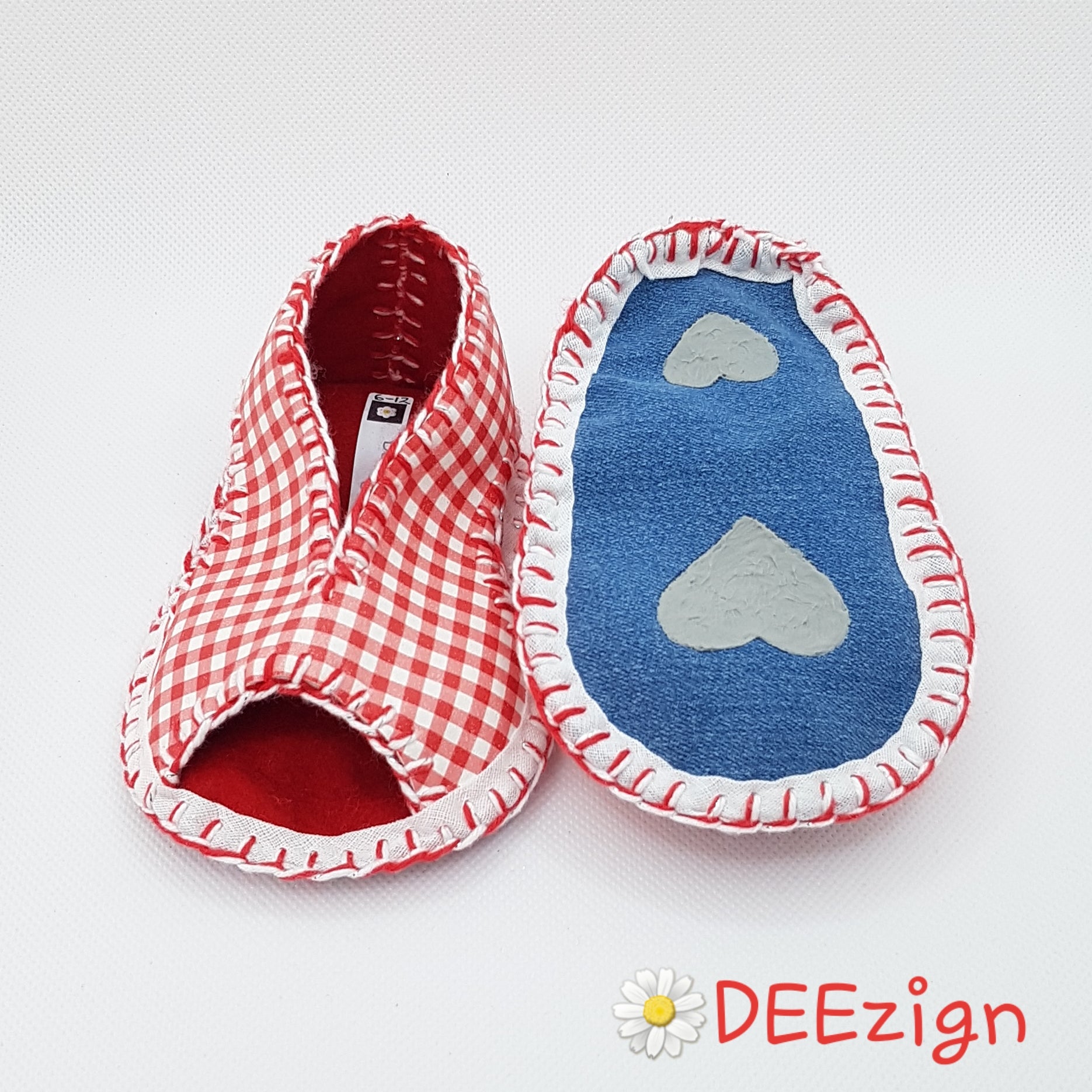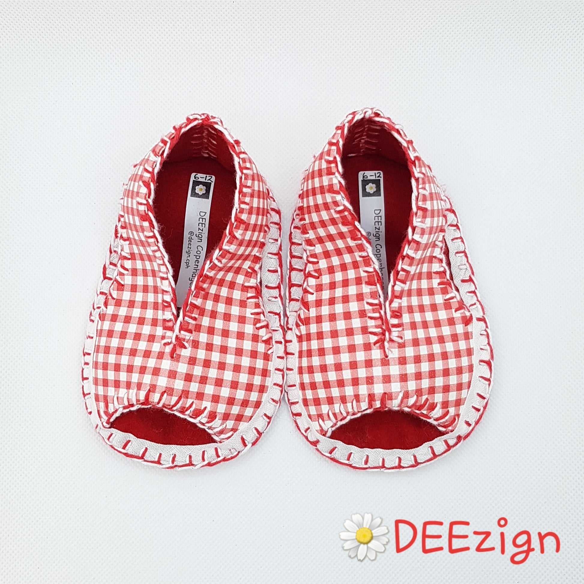 Lækre håndsyede baby sutsko sandaler i en farveblanding af ternet rød & hvide nuancer pyntet med glitter.