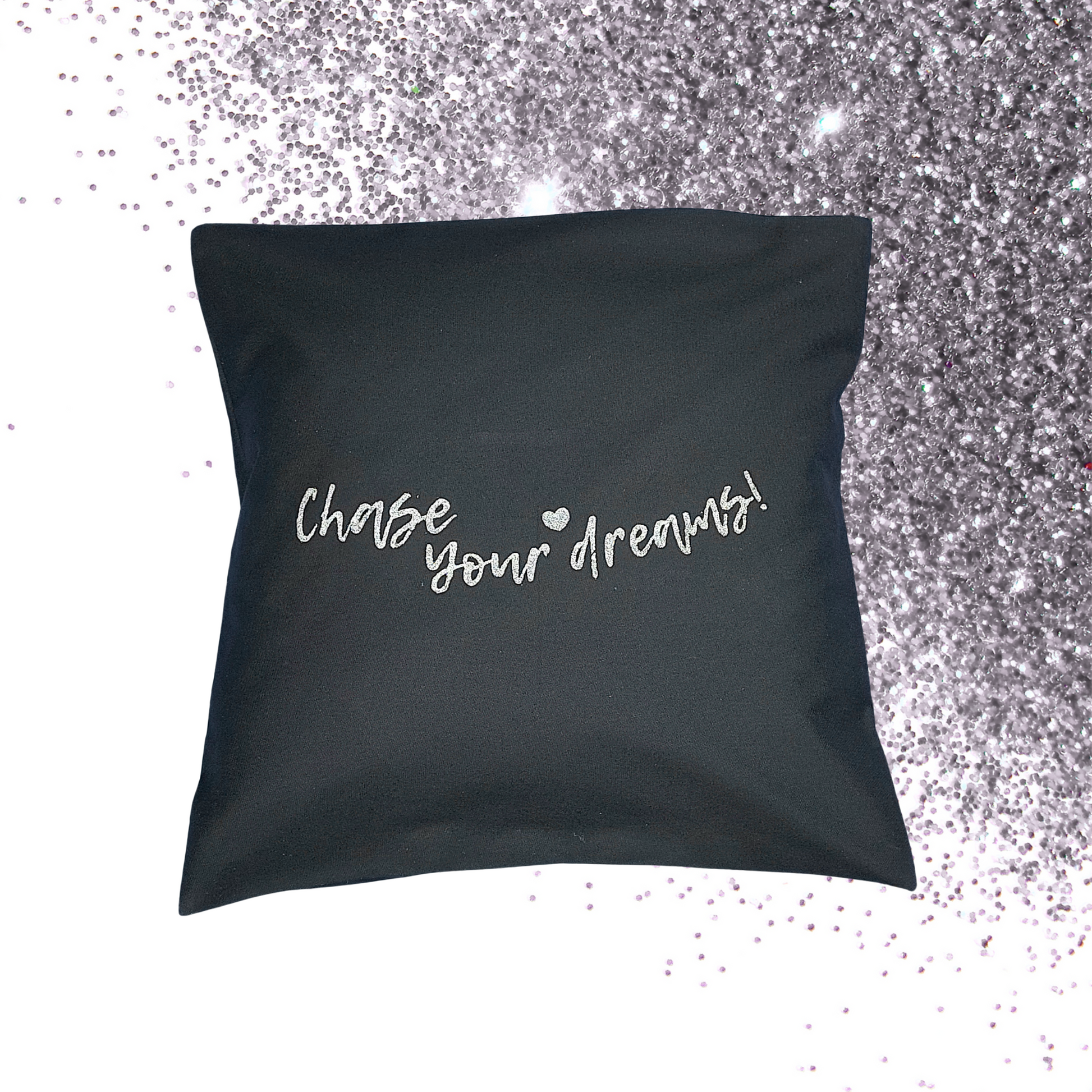 Pudebetræk - Chase your dreams! - Glimmer: sølv (40x40 cm)