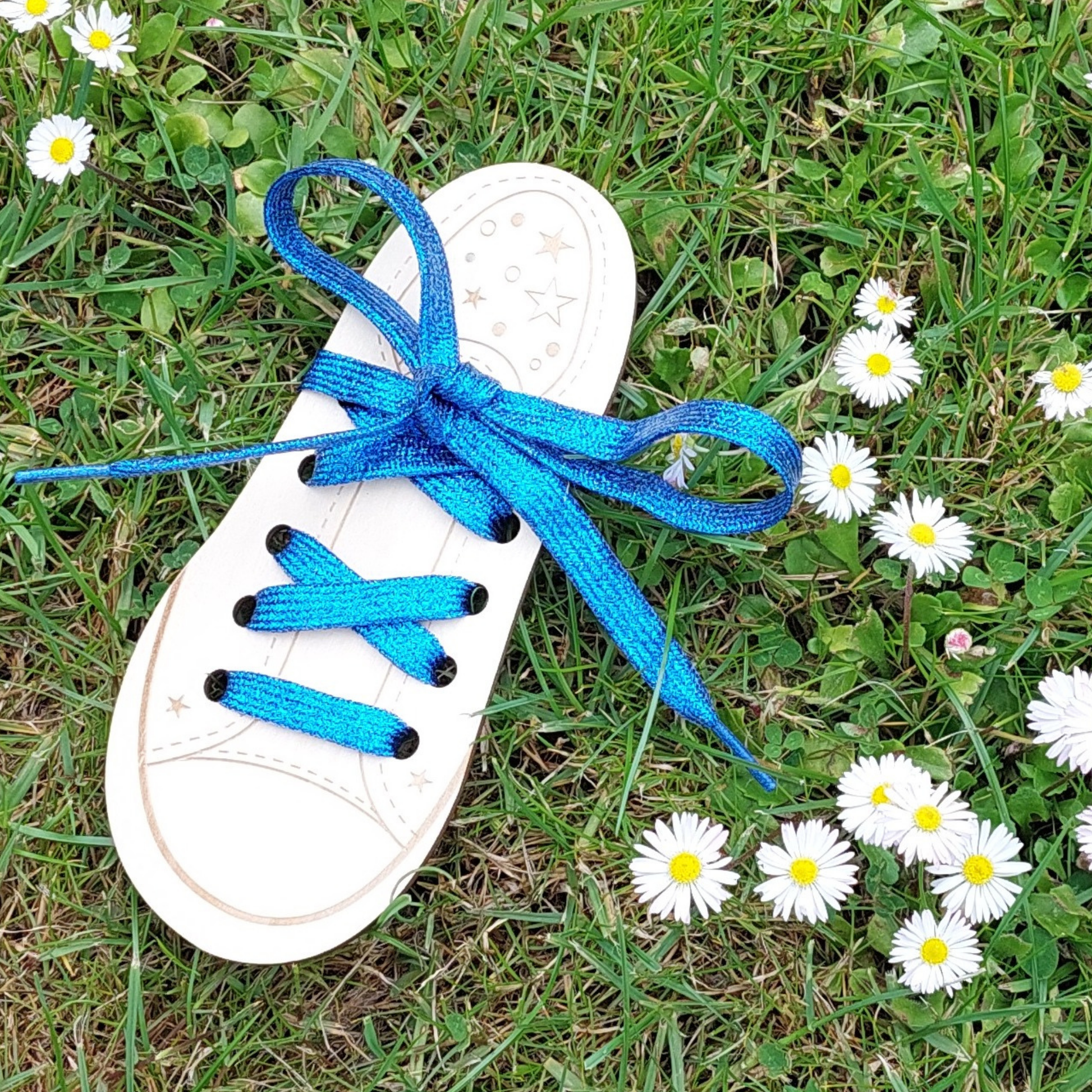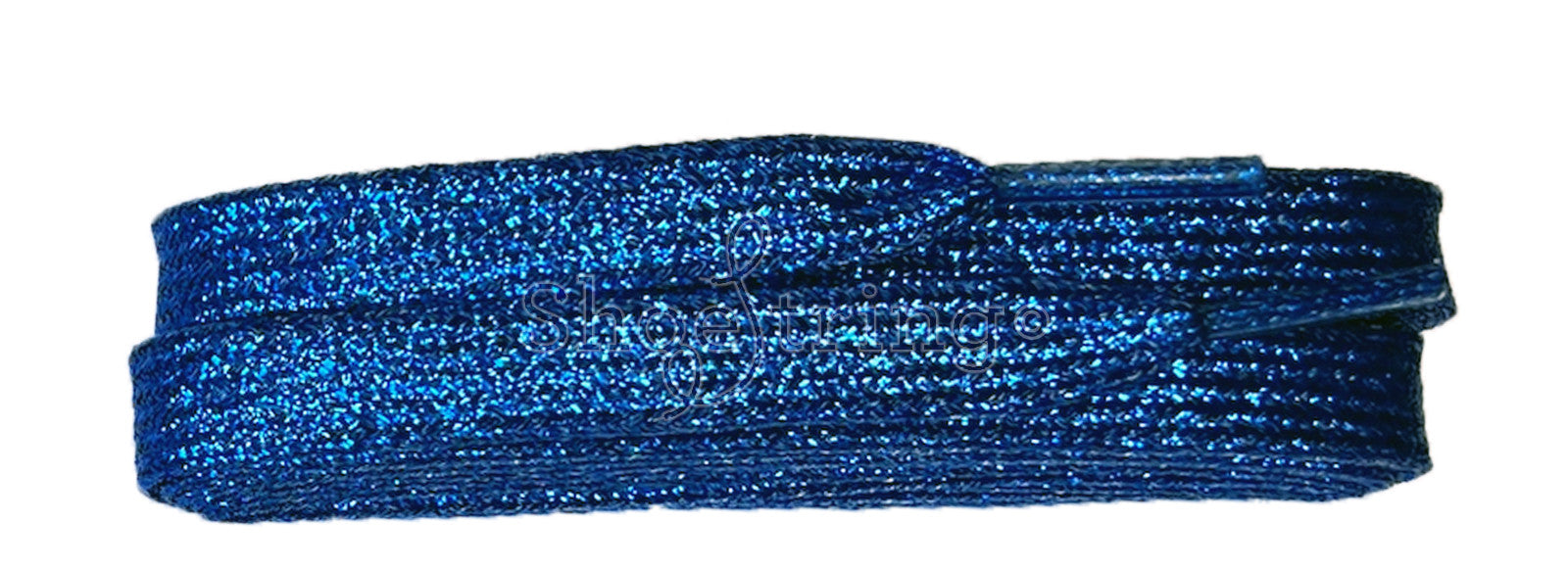 Trendy glimmer snørebånd i metallisk blå.