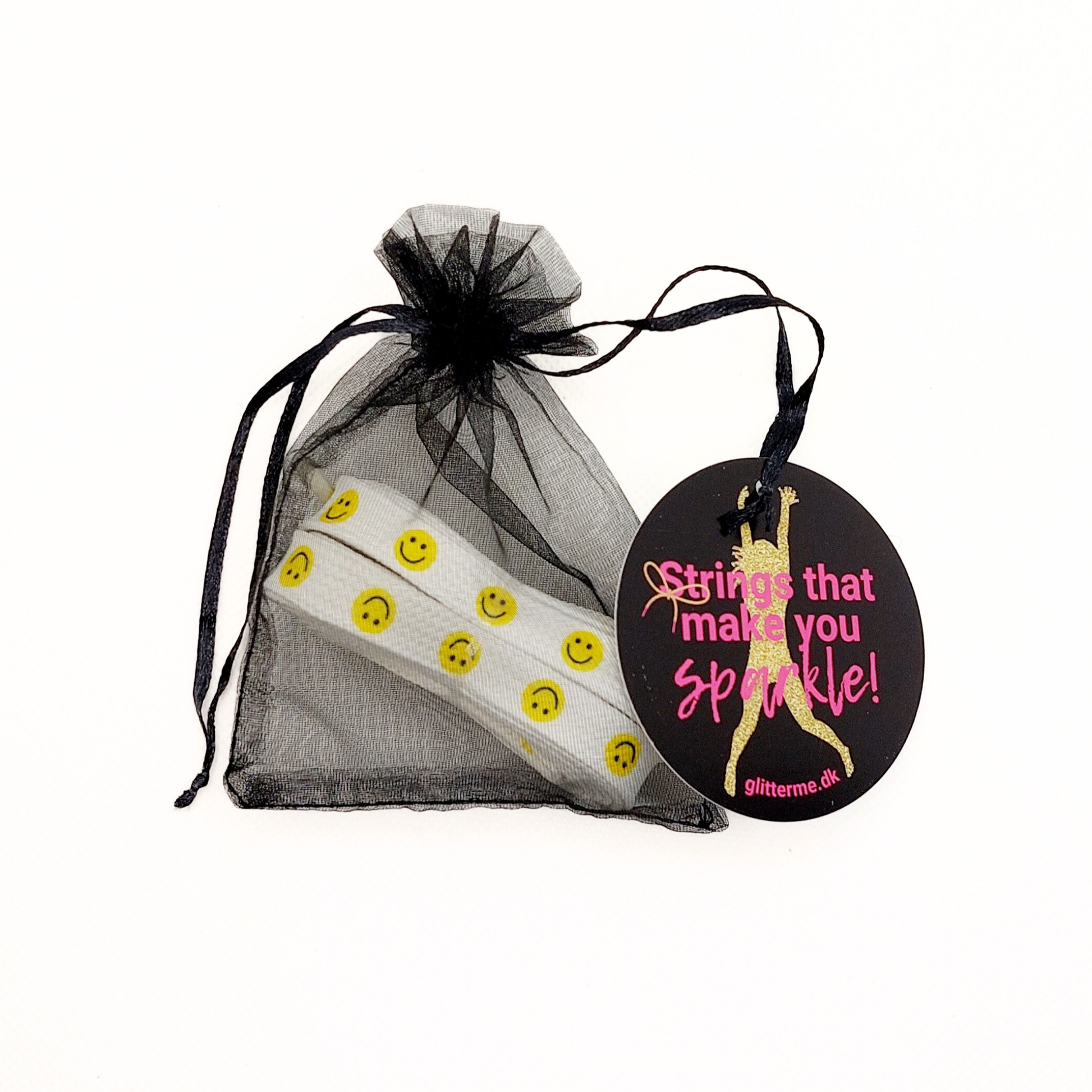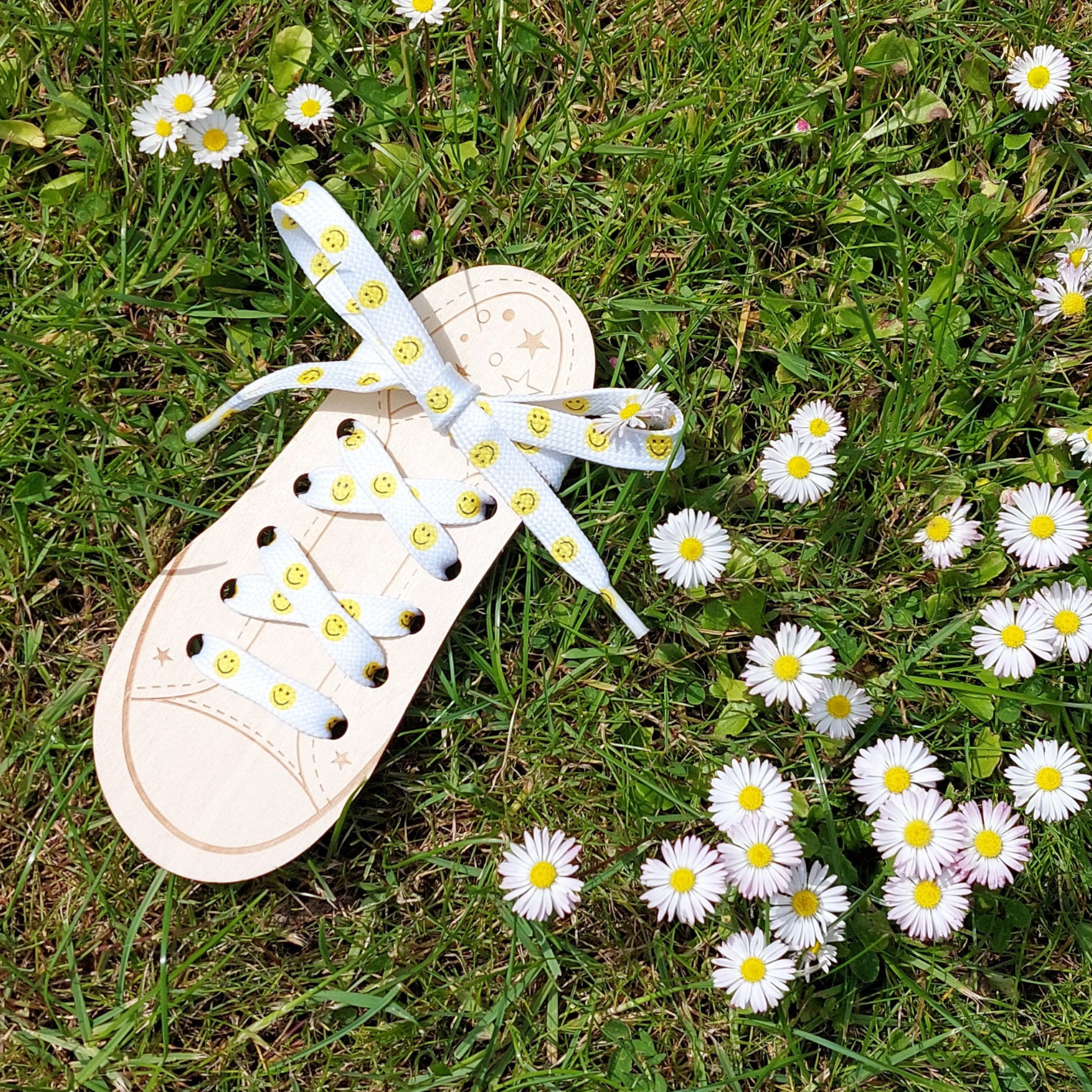 Trendy hvid snørebånd med gule smiley ansigter.