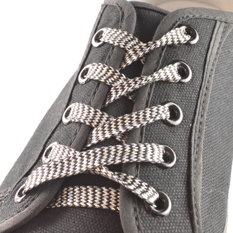 Trendy glimmer snørebånd i sort og metallisk sølv.