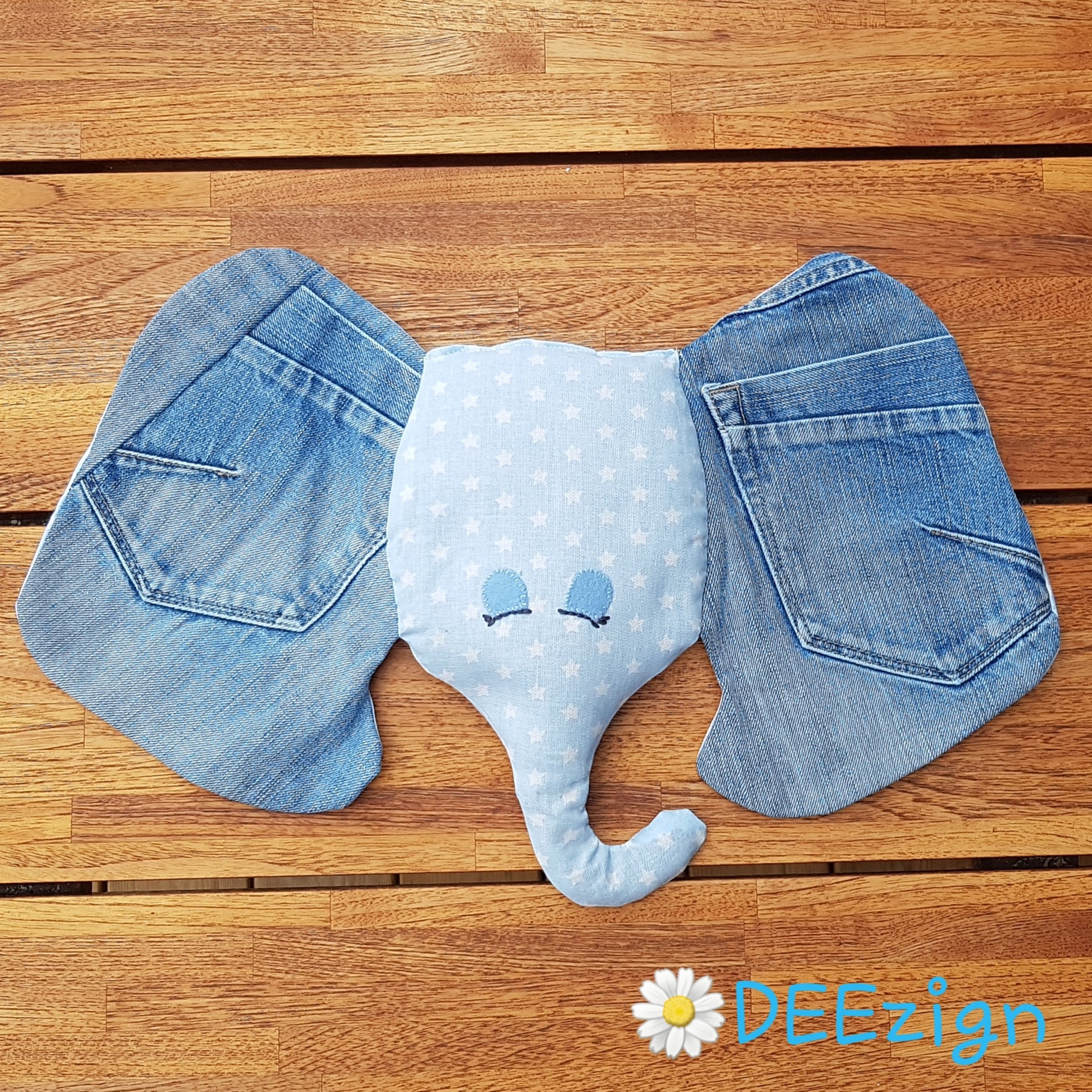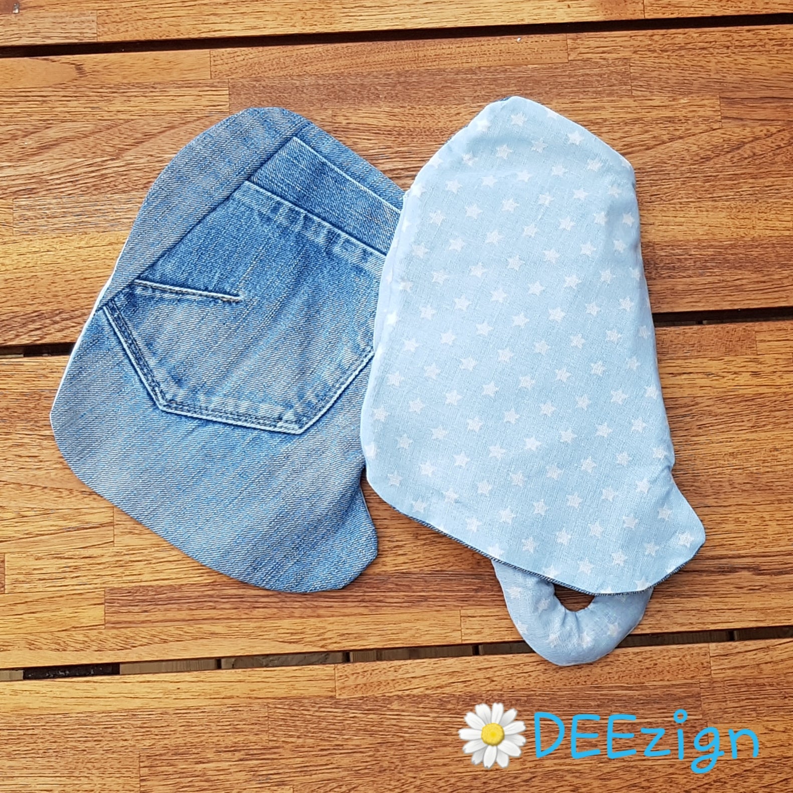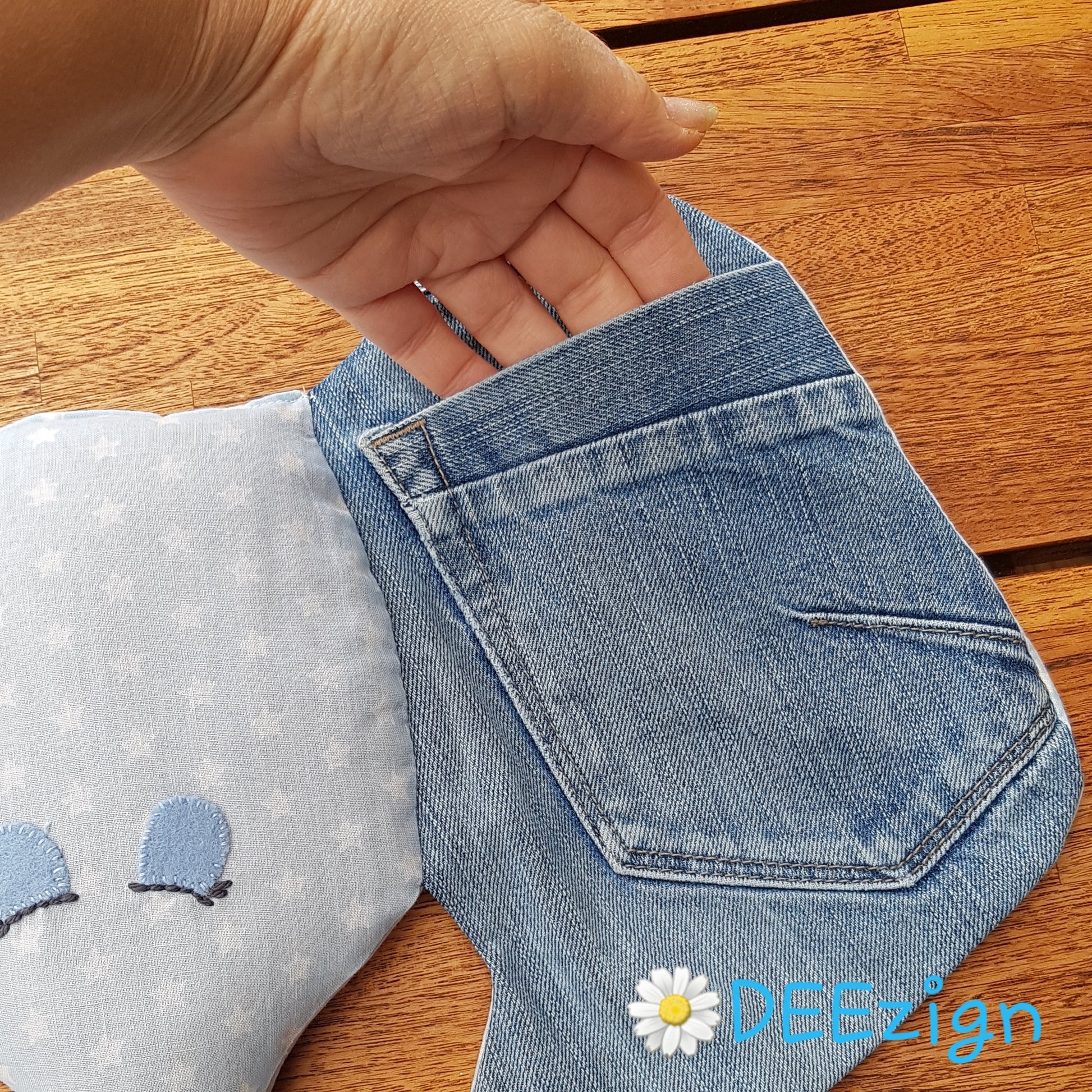 ✿ Front of ears: Upcycled blue denim fabric including pockets