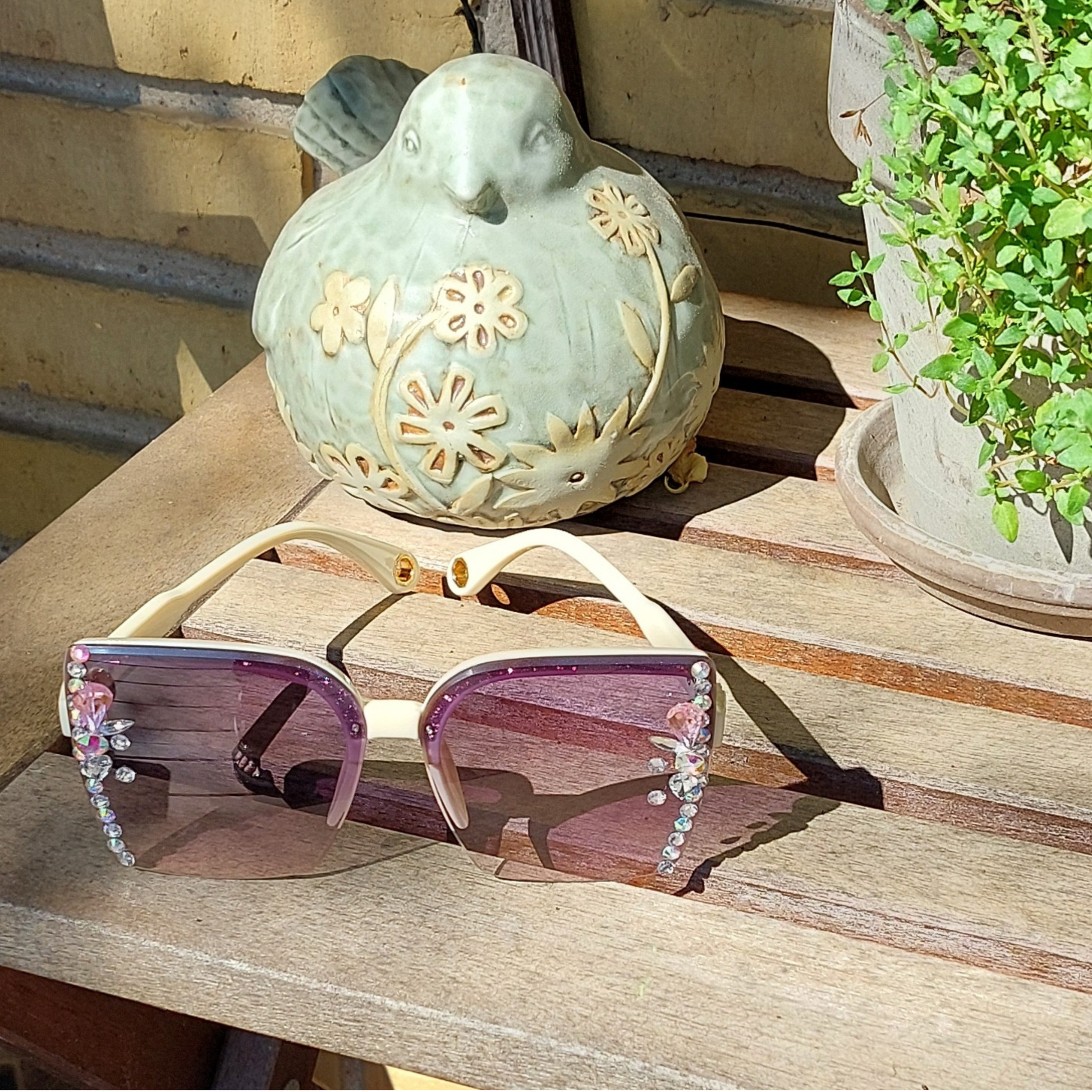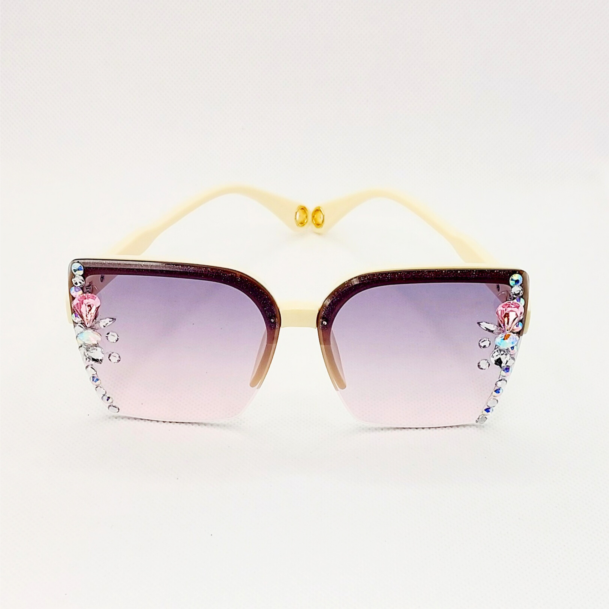 Smukke sommer solbriller med et hvidt stel pyntet med similisten samt grå/pink gradient linser.