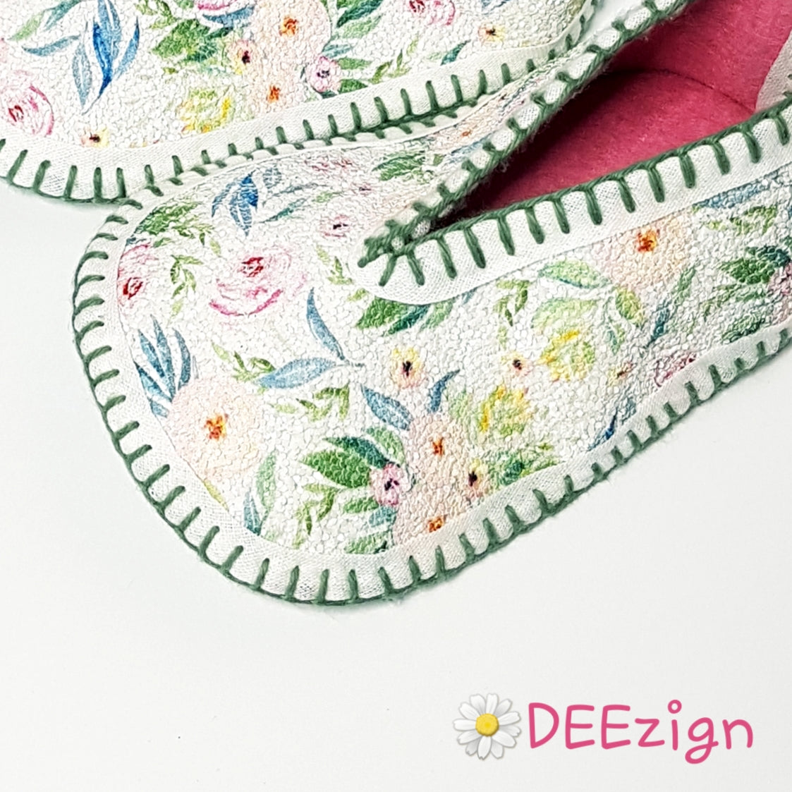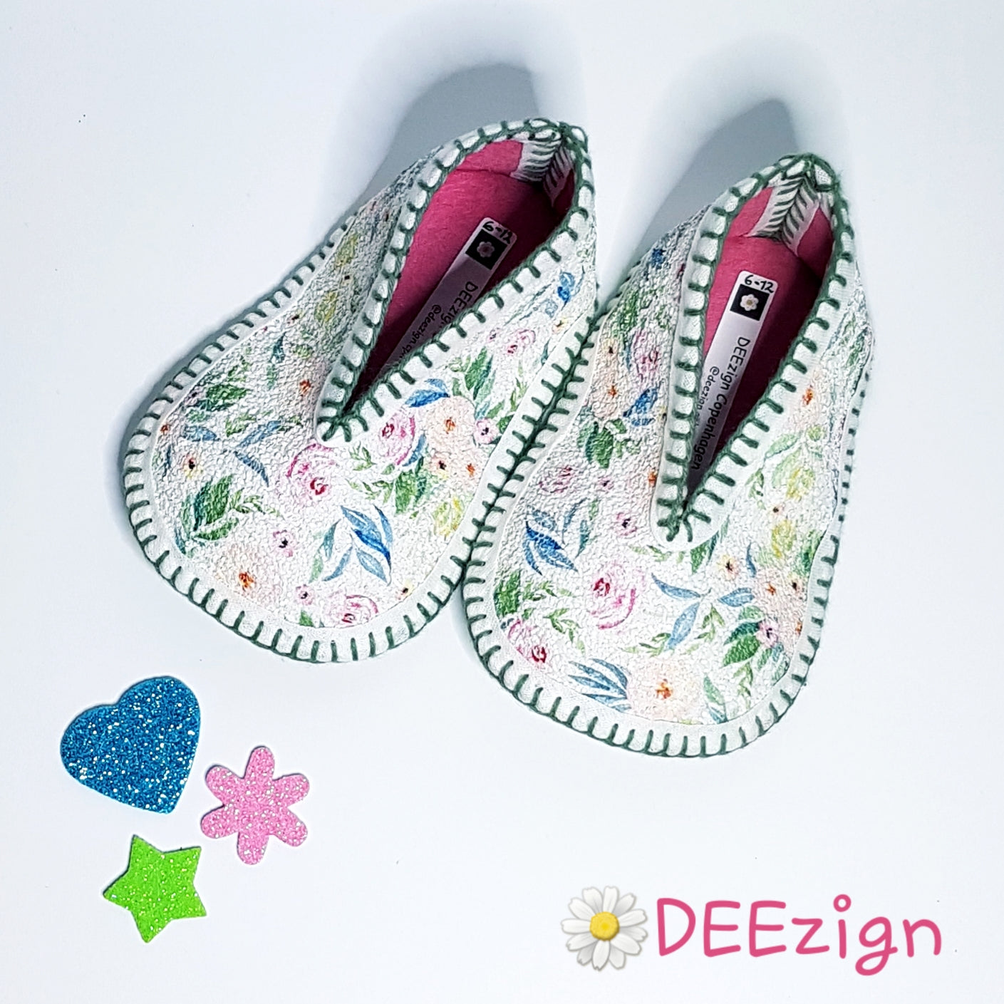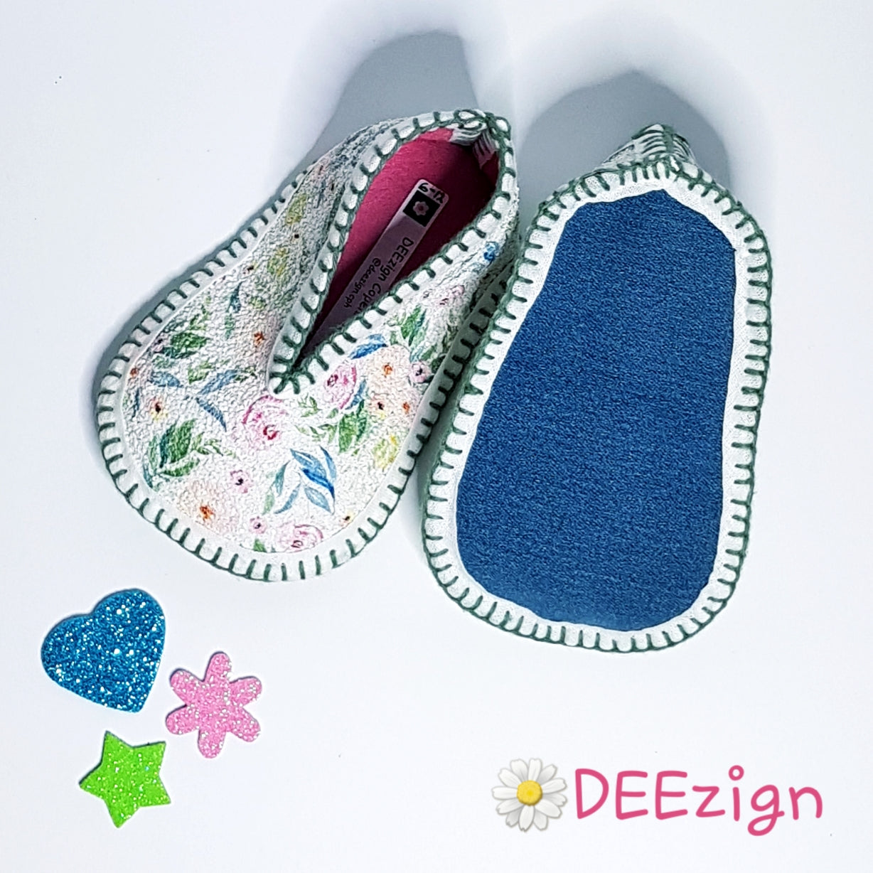✿ Udvendig sål: Upcycled denimstof & håndmalede skridsikre motiver