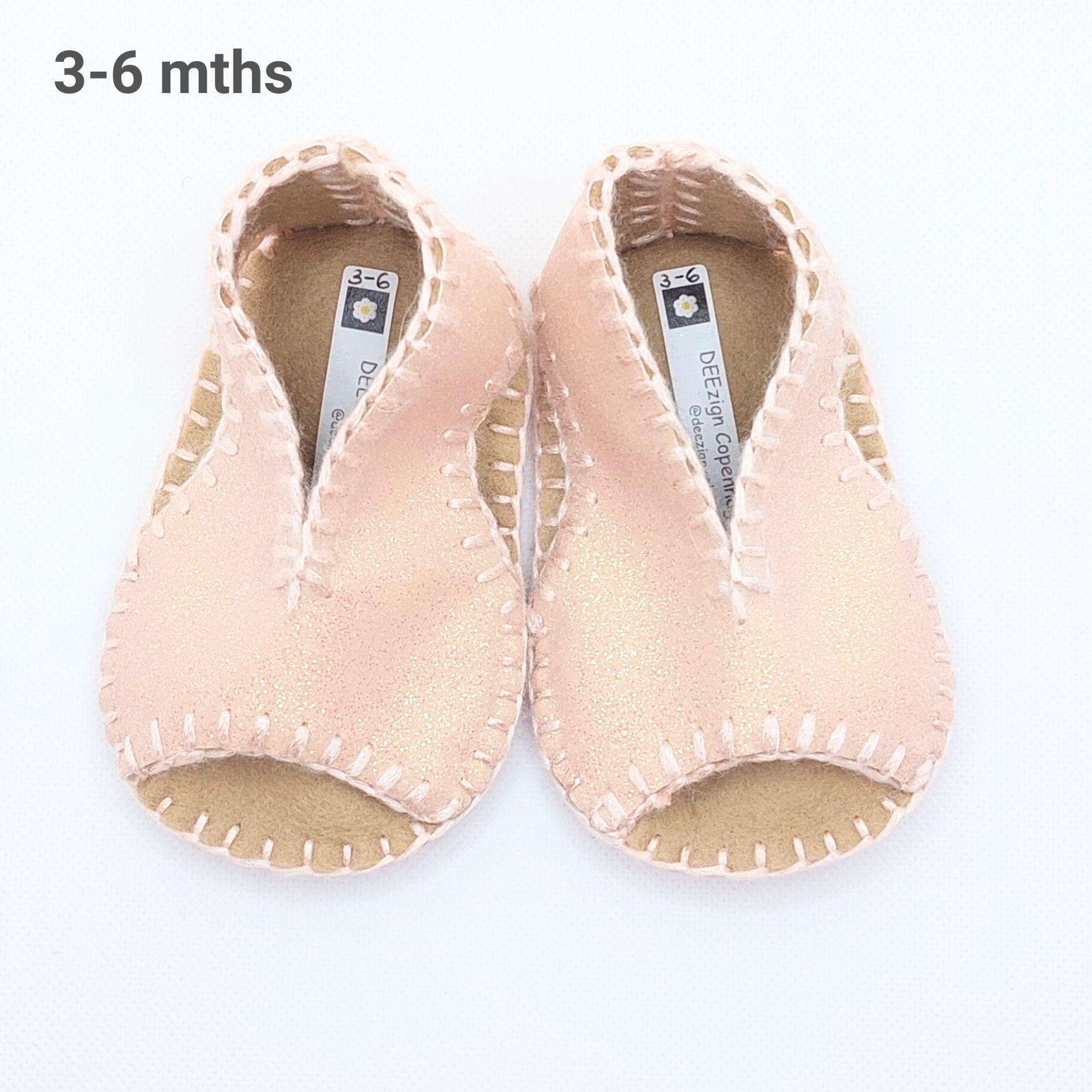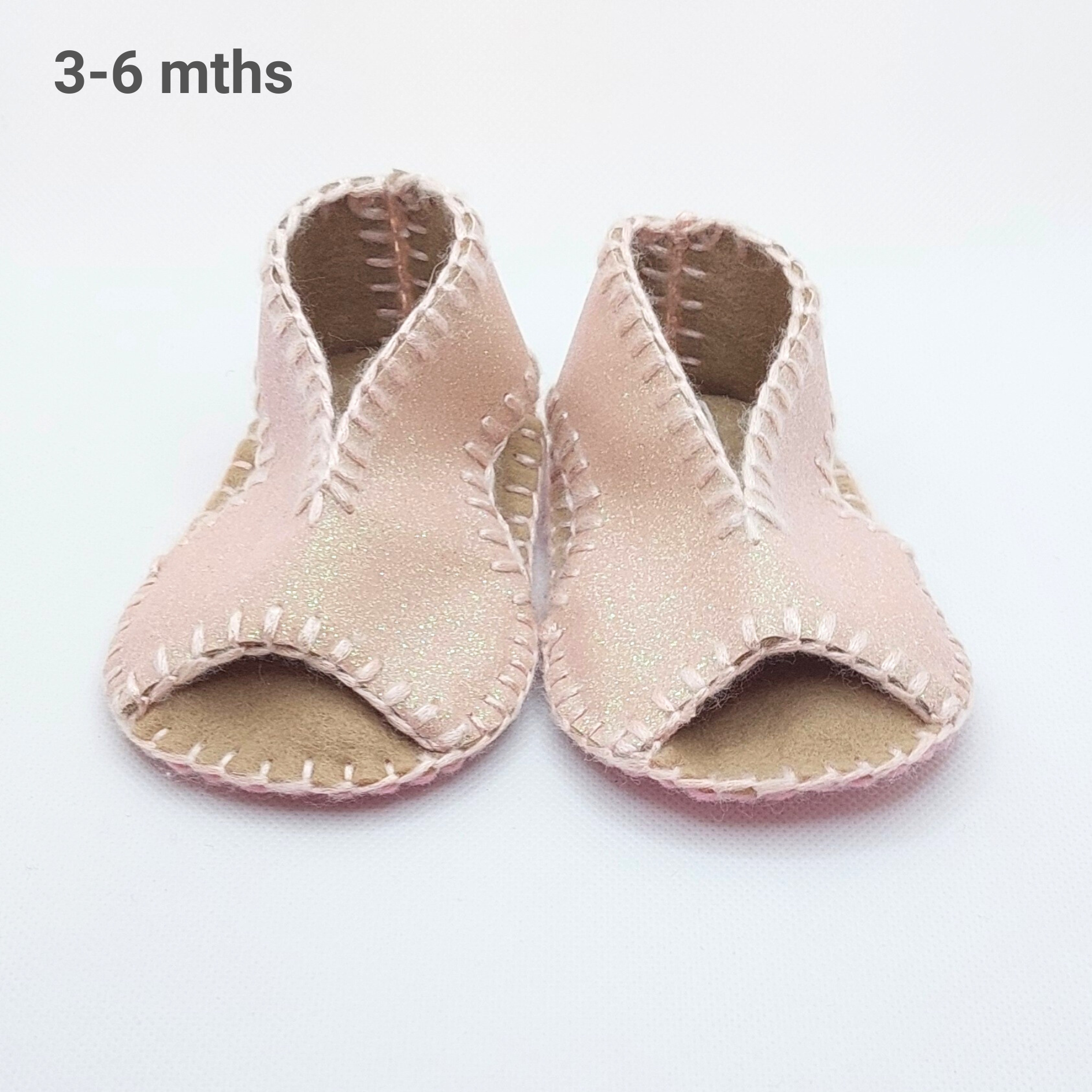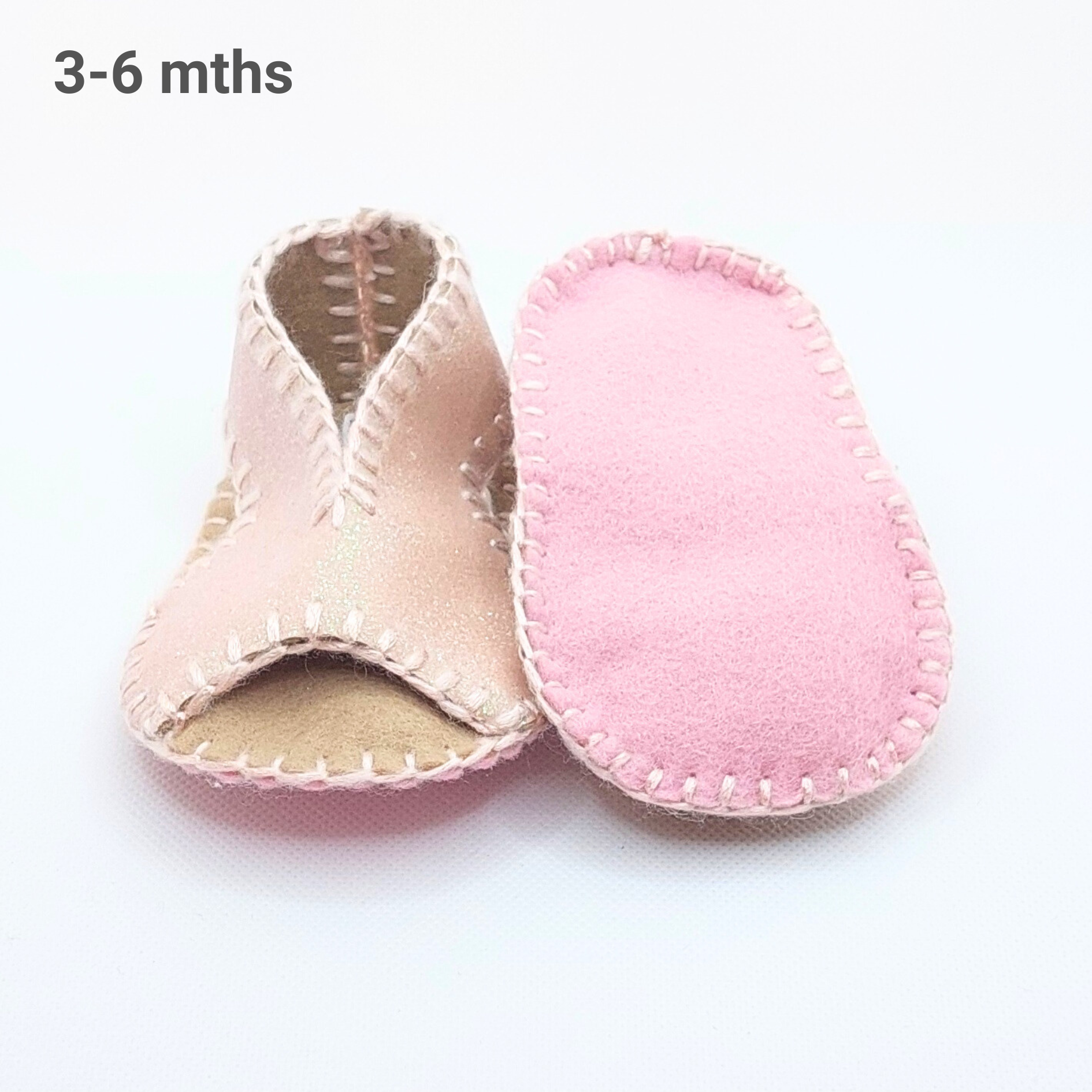 Smukke håndsyede baby sutsko uldsandaler i en farveblanding af glitrende karamel og støvede lyserøde nuancer.