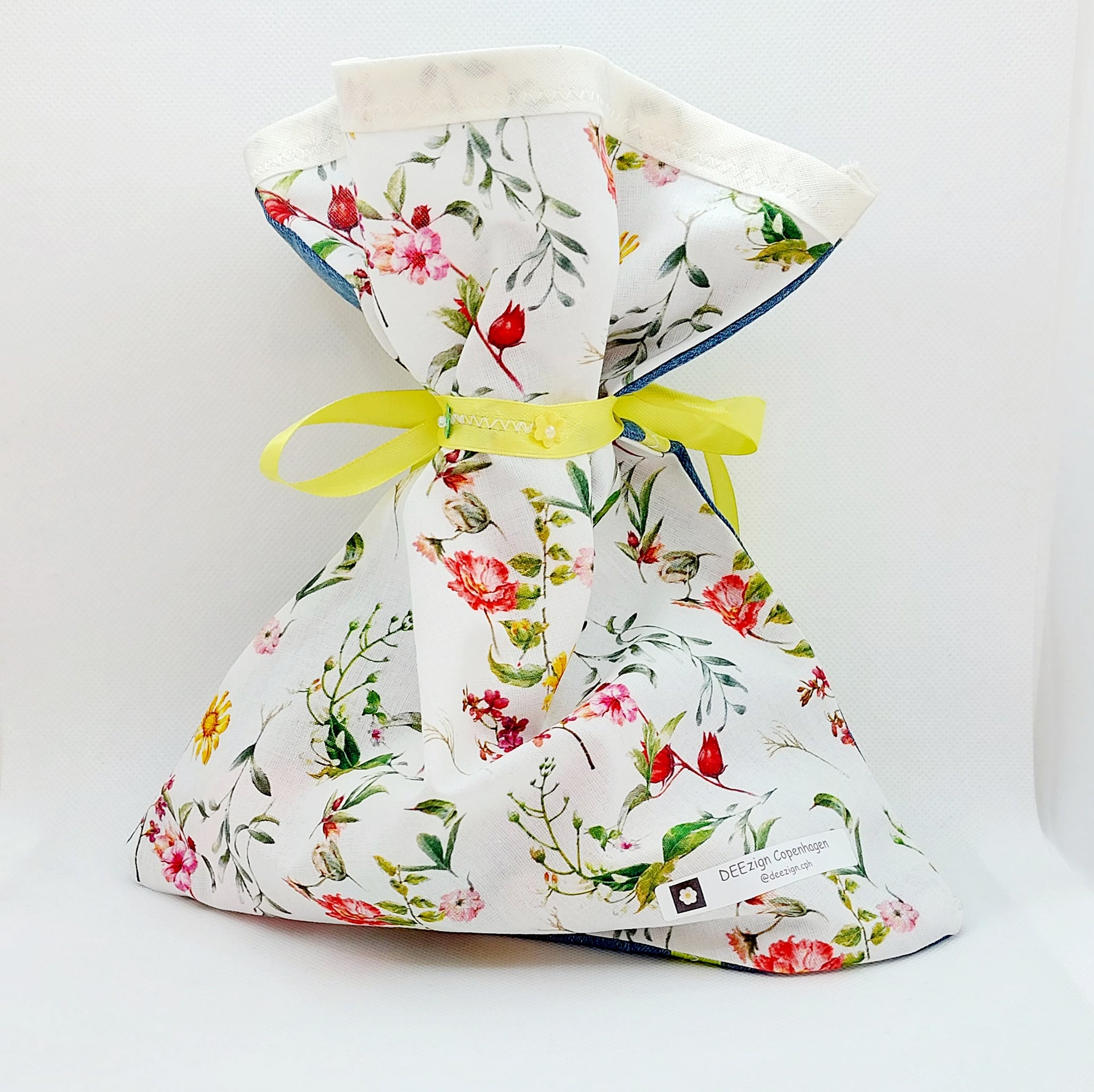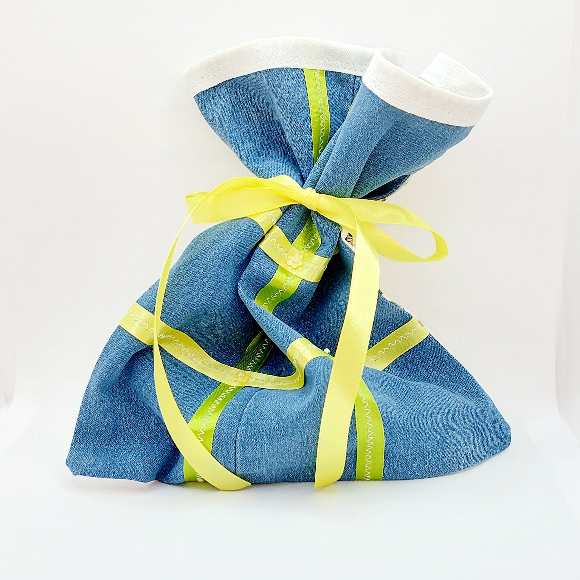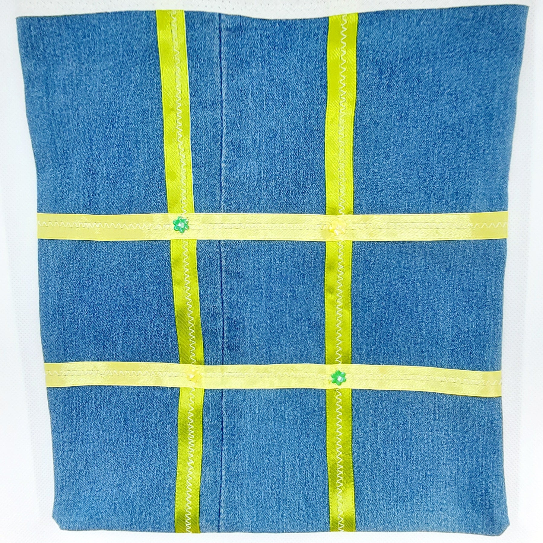 ✿ Taske & spillebræt: Upcycled denim pyntet med gult satinbånd