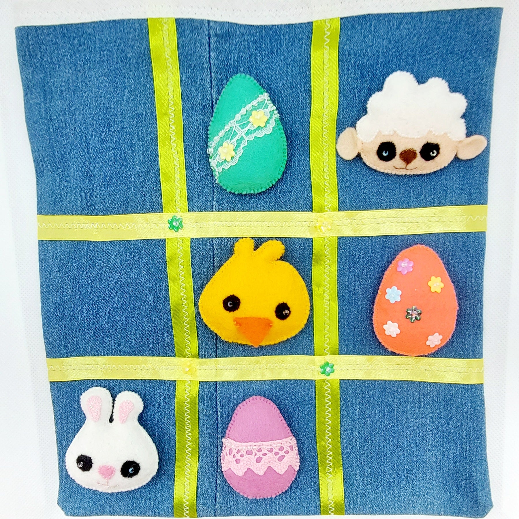 Håndsyede kryds og bolle spil med søde påskefigurer og dekorerede æg.