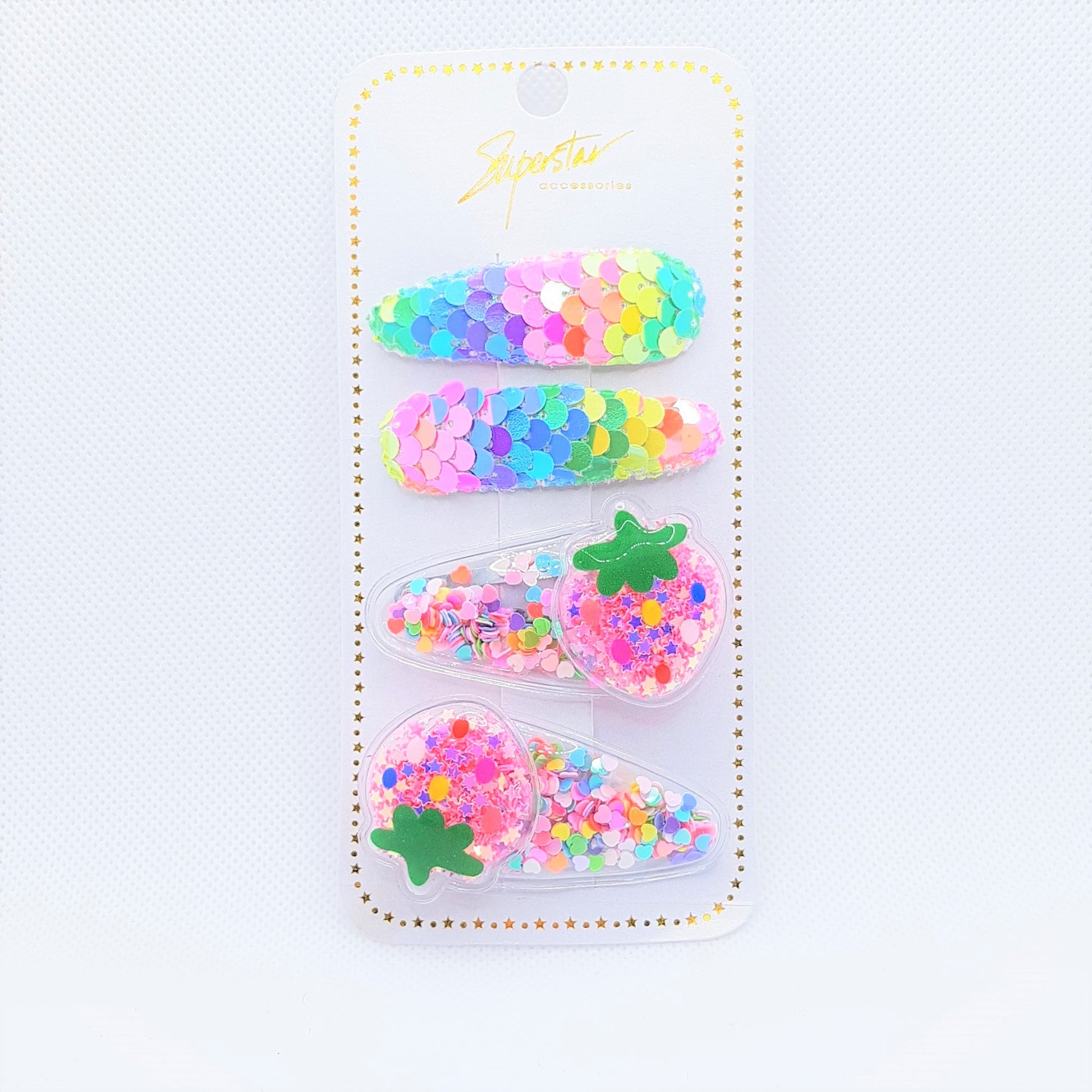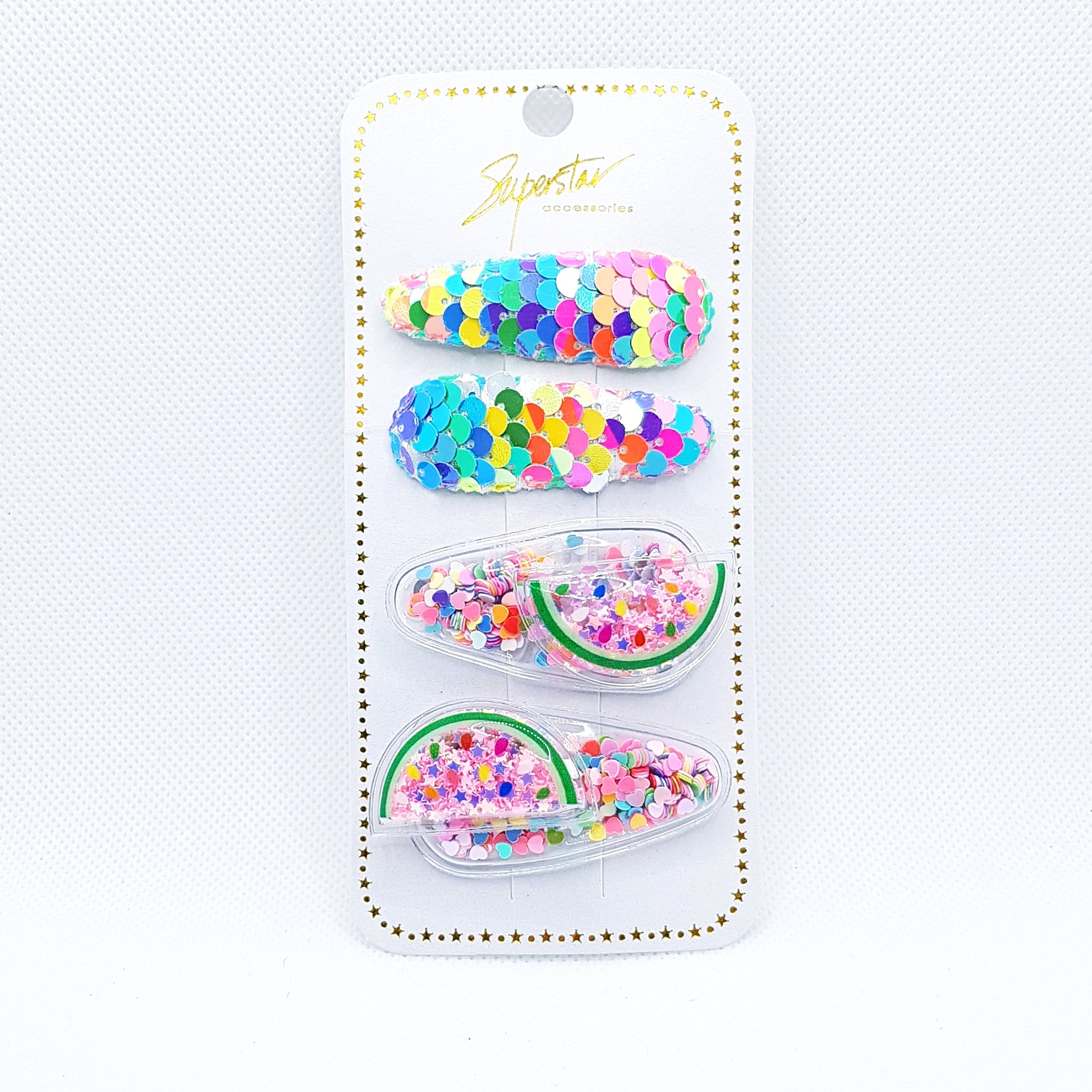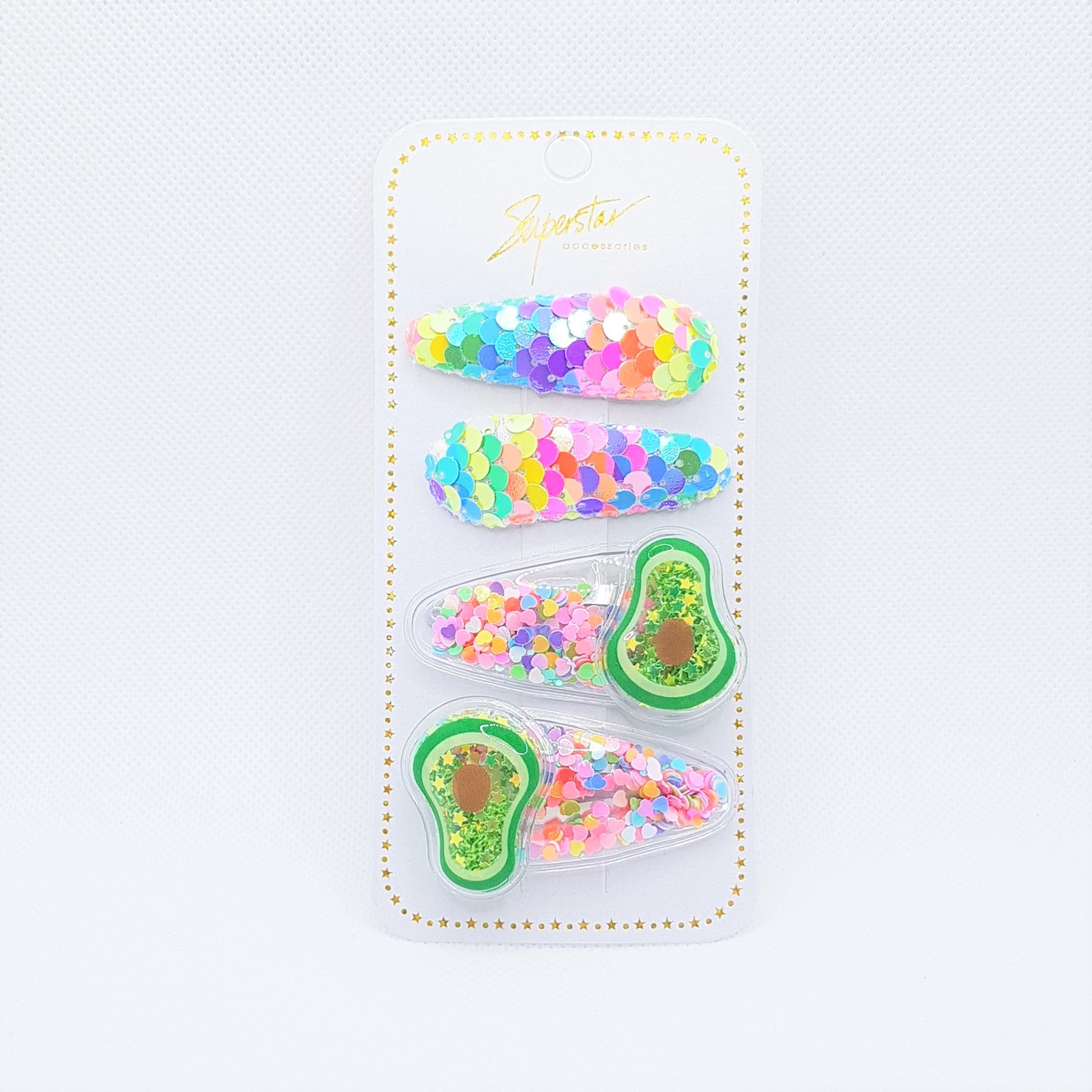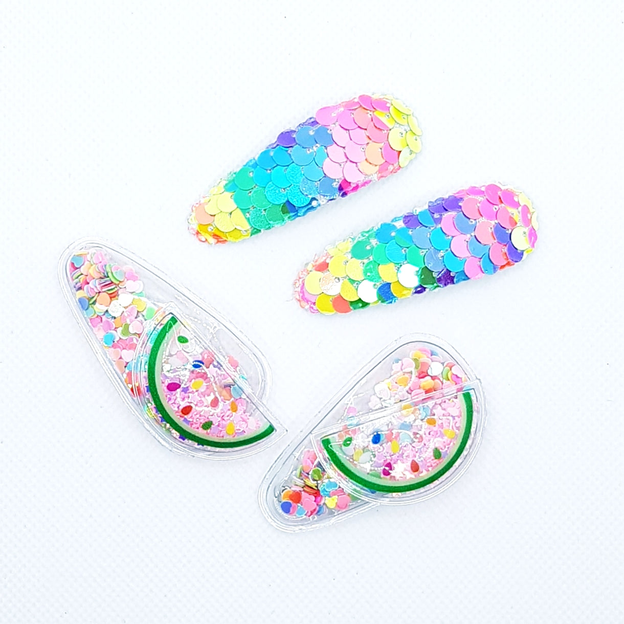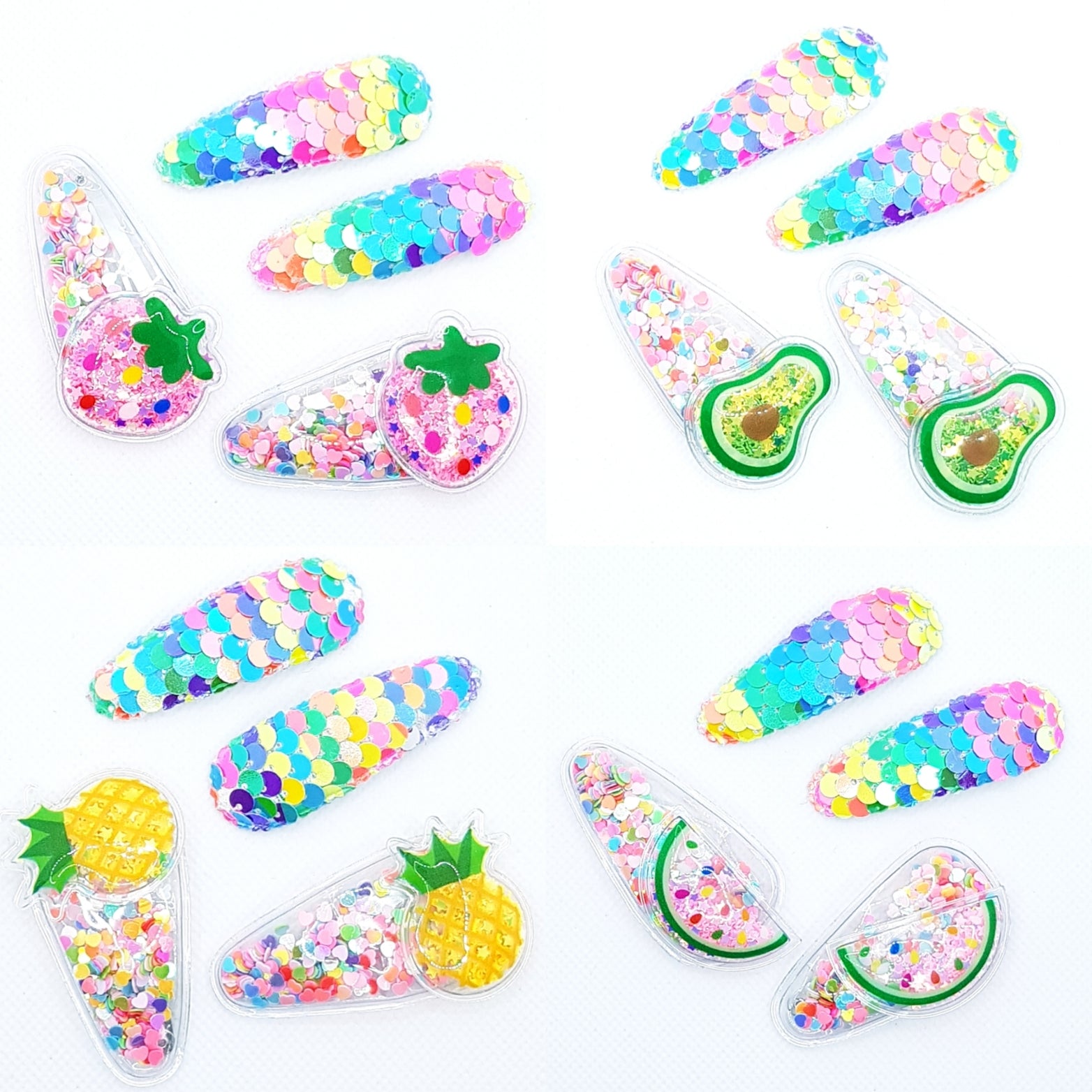 MEGA cute frugt og havfrue hårklemmer fyldt med glitrende og farverige konfetti (shakers) og pyntet med pailletter.