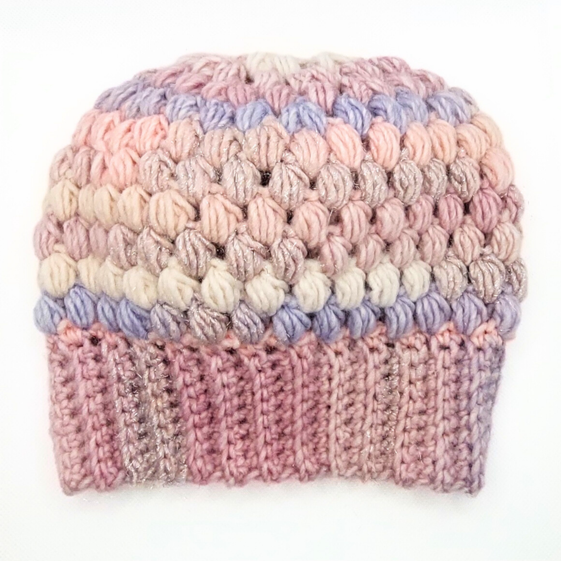 MEGA cute og blød vinterhue i pastel pink, lilla, blå og naturhvid farver med et strejf af sølv glimmer.